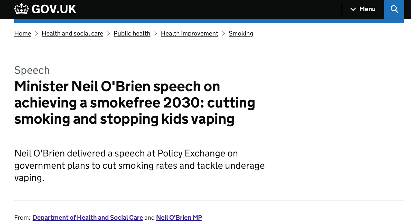 近日,英国卫生部长Neil O’Brien发表控烟主题演讲,称电子烟是戒断卷烟的有力工具,英国政府正通过免费向烟民发电子烟等方式开发其巨大的戒烟潜力,以实现2030年的全国“无烟”(smoke free)目标。