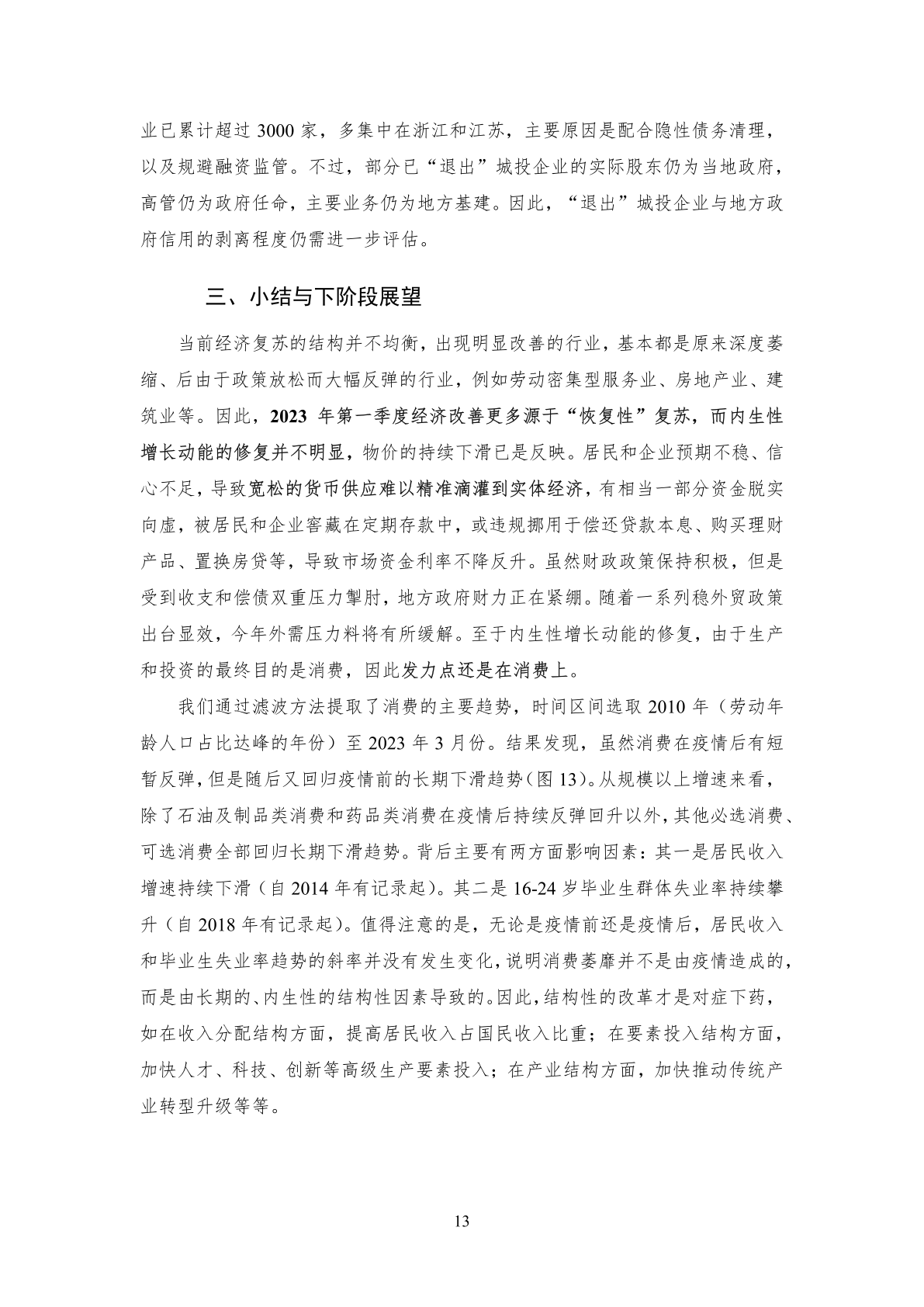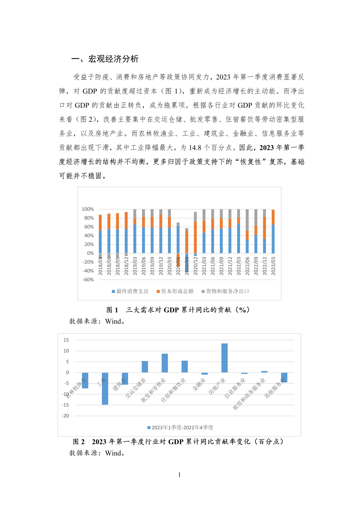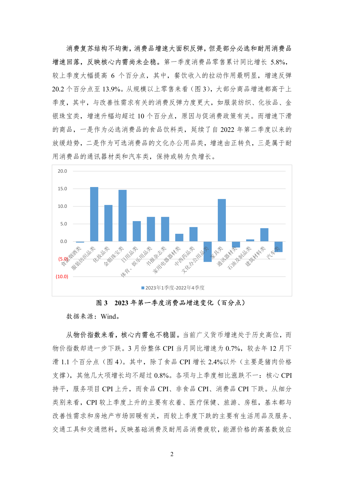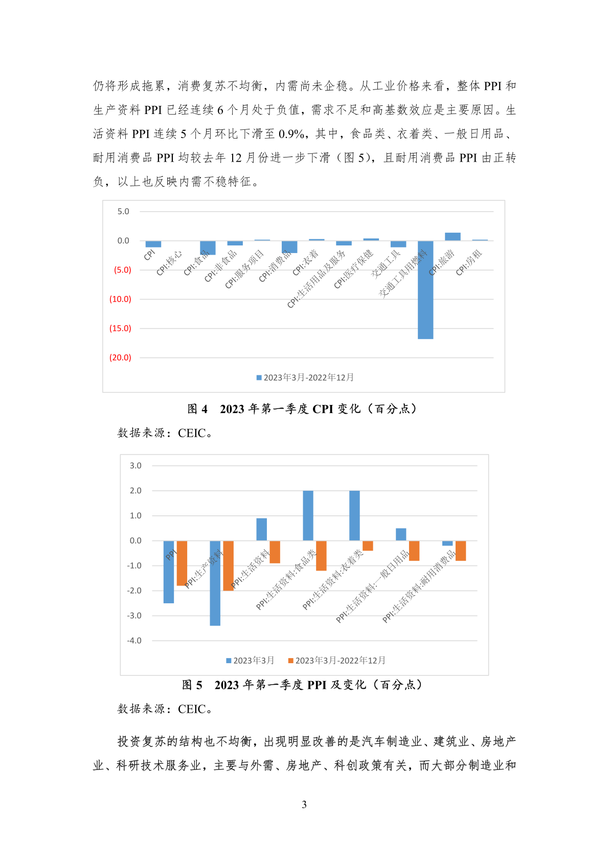 当前经济复苏的结构并不均衡,出现明显改善的行业, 基本都是原来深度萎缩、后由于政策放松而大幅反弹的行业, 例如劳动密集型服务业、房地产业、建筑业等。因此,2023 年第一季度经济改善更多源于“恢复性”复苏,而内生性增 长动能的修复并不明显,物价的持续下滑已是反映。由于居 民和企业预期不稳、信心不足,导致宽松的货币供应难以精 准滴灌到实体经济,有相当一部分资金脱实向虚,被居民和 企业窖藏在定期存款中,或违规挪用于偿还贷款本息、购买 理财产品、置换房贷等,导致市场资金利率不降反升。虽然 财政政策保持积极,但是受到收支和偿债双重压力掣肘,地 方政府财力正在紧绷。随着一系列稳外贸政策显效,今年外 需压力料将有所缓解。至于内生性增长动能的修复,由于生 产和投资的最终目的是消费,因此发力点还是在消费上。