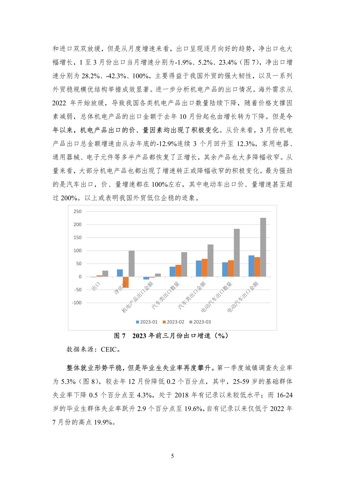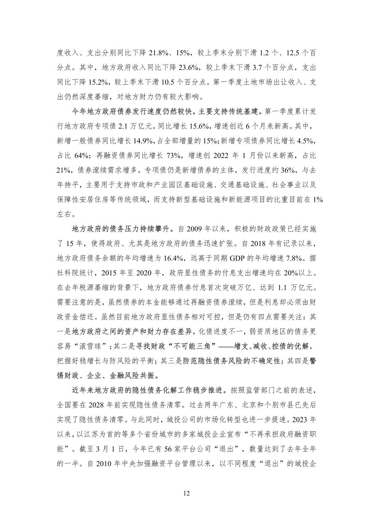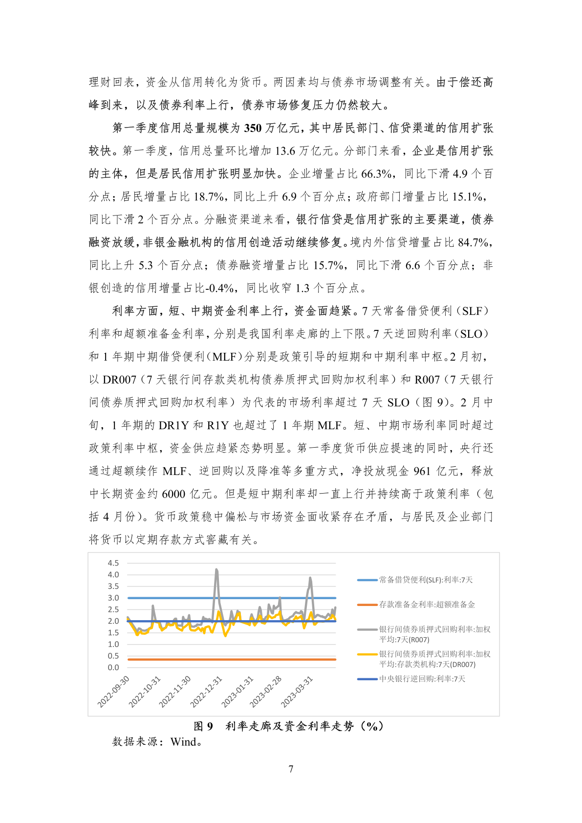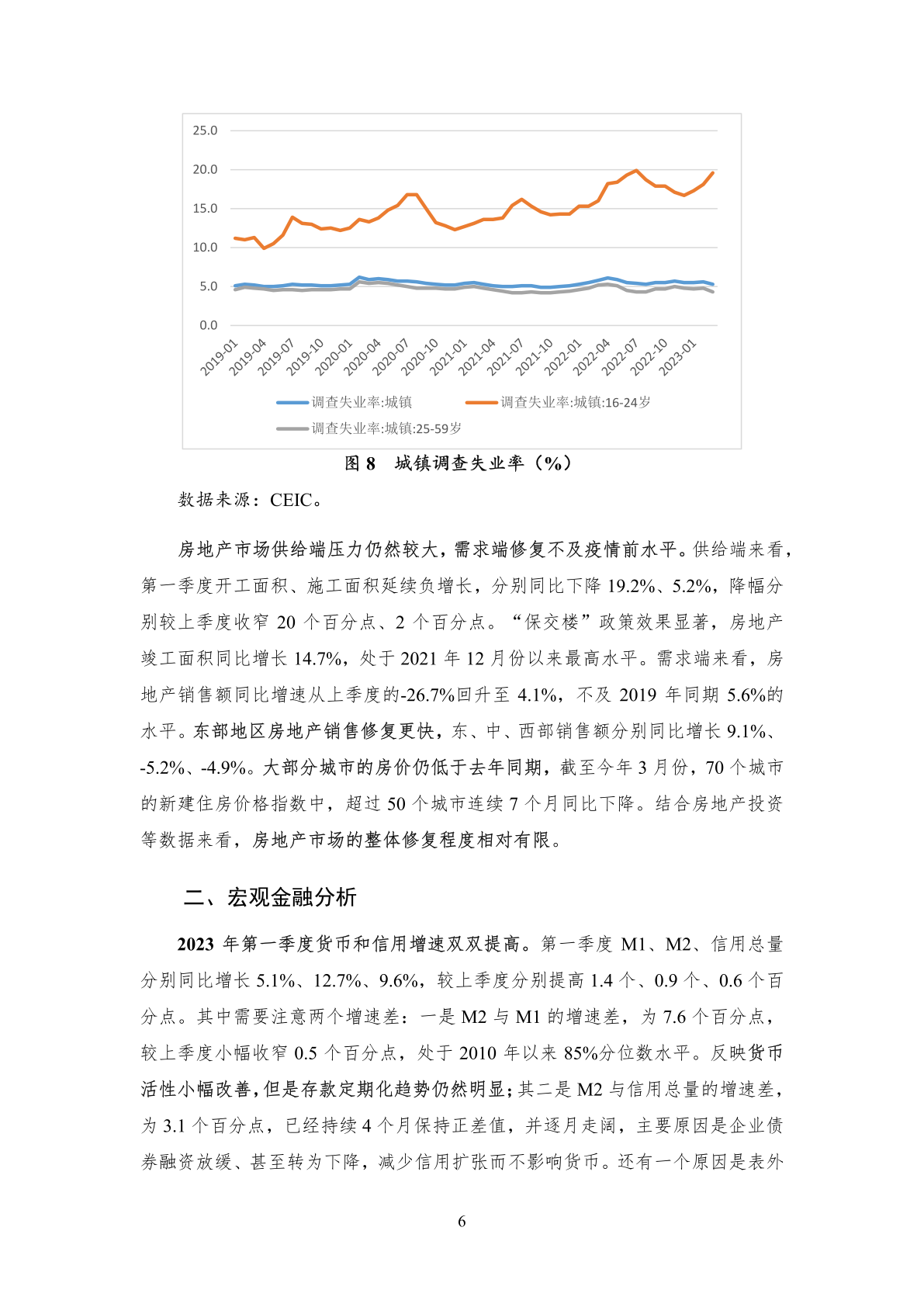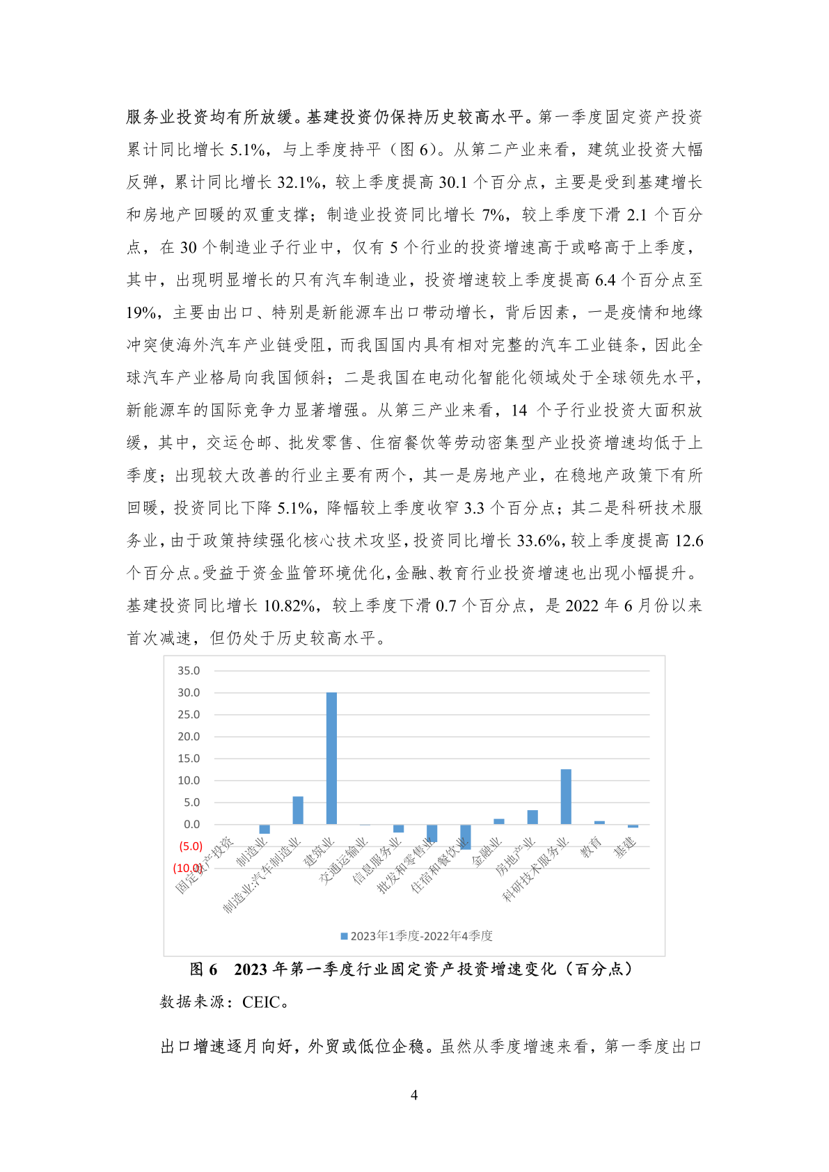 当前经济复苏的结构并不均衡,出现明显改善的行业, 基本都是原来深度萎缩、后由于政策放松而大幅反弹的行业, 例如劳动密集型服务业、房地产业、建筑业等。因此,2023 年第一季度经济改善更多源于“恢复性”复苏,而内生性增 长动能的修复并不明显,物价的持续下滑已是反映。由于居 民和企业预期不稳、信心不足,导致宽松的货币供应难以精 准滴灌到实体经济,有相当一部分资金脱实向虚,被居民和 企业窖藏在定期存款中,或违规挪用于偿还贷款本息、购买 理财产品、置换房贷等,导致市场资金利率不降反升。虽然 财政政策保持积极,但是受到收支和偿债双重压力掣肘,地 方政府财力正在紧绷。随着一系列稳外贸政策显效,今年外 需压力料将有所缓解。至于内生性增长动能的修复,由于生 产和投资的最终目的是消费,因此发力点还是在消费上。