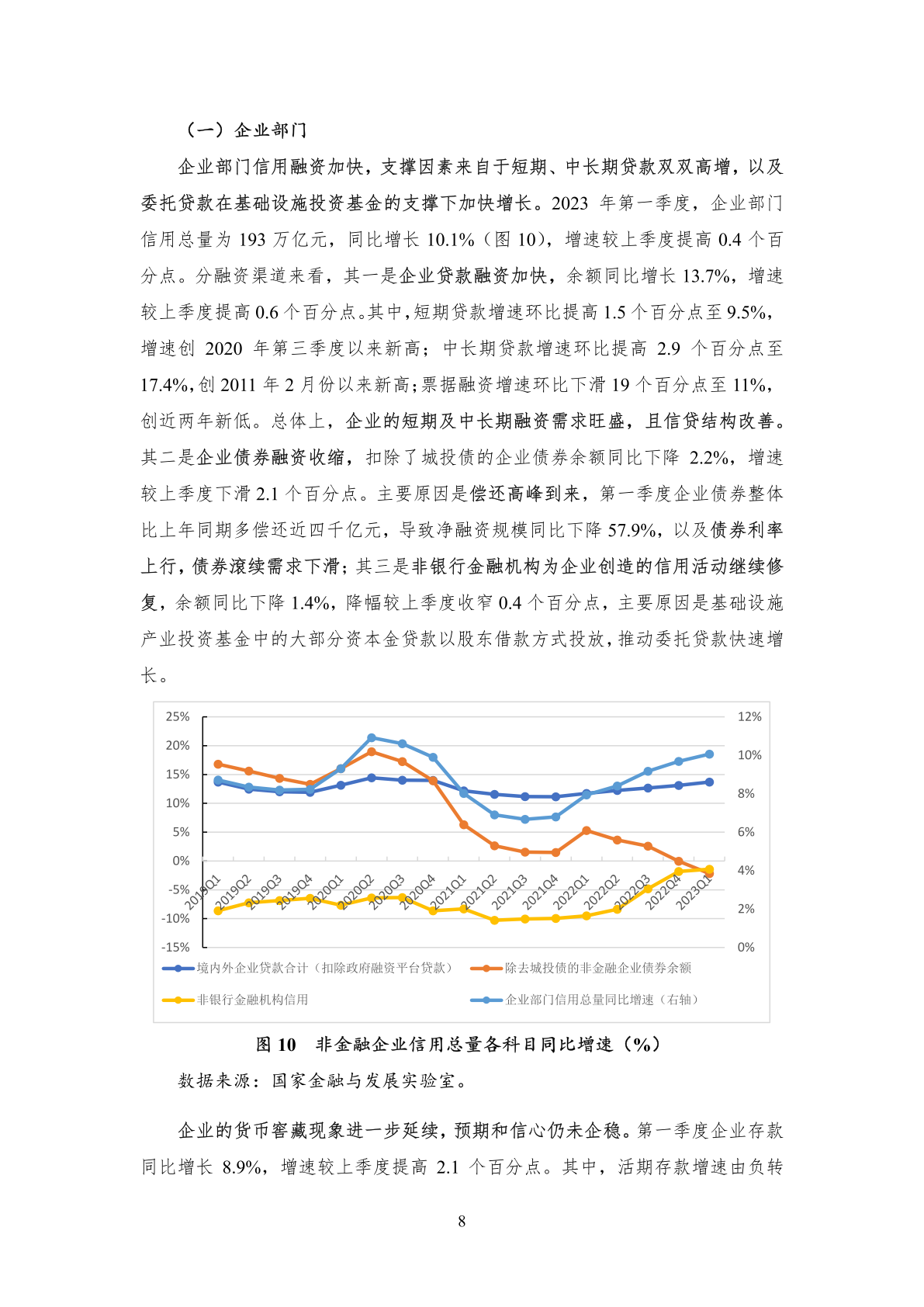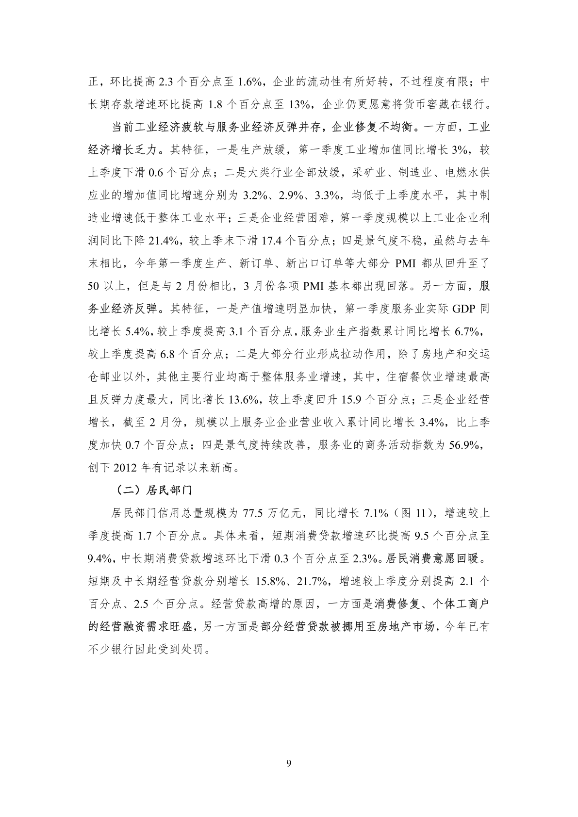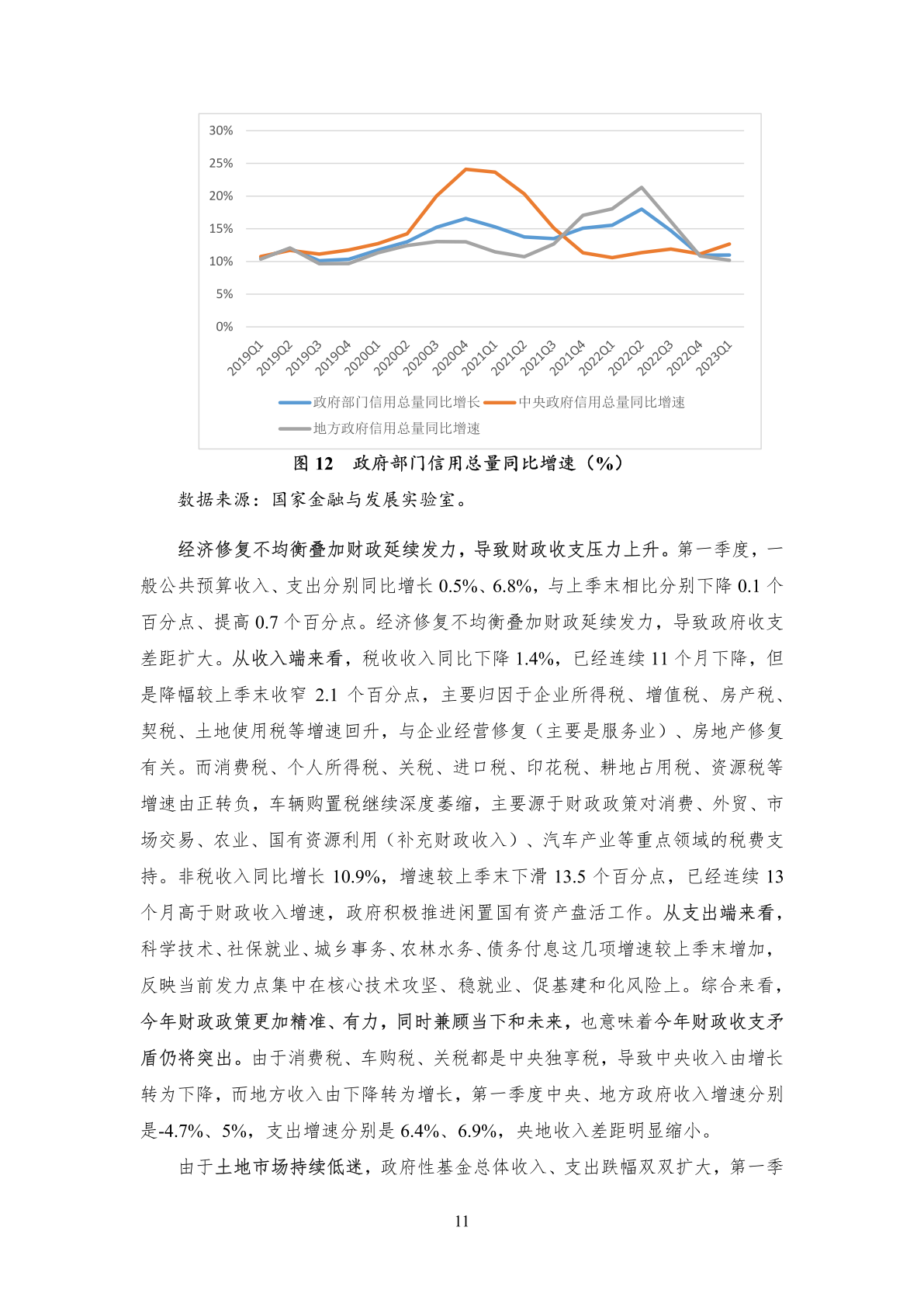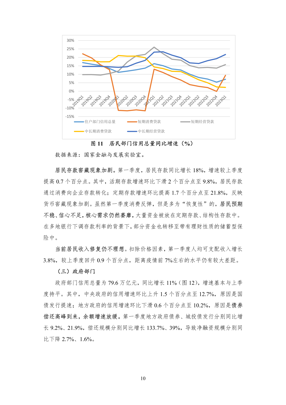 当前经济复苏的结构并不均衡,出现明显改善的行业, 基本都是原来深度萎缩、后由于政策放松而大幅反弹的行业, 例如劳动密集型服务业、房地产业、建筑业等。因此,2023 年第一季度经济改善更多源于“恢复性”复苏,而内生性增 长动能的修复并不明显,物价的持续下滑已是反映。由于居 民和企业预期不稳、信心不足,导致宽松的货币供应难以精 准滴灌到实体经济,有相当一部分资金脱实向虚,被居民和 企业窖藏在定期存款中,或违规挪用于偿还贷款本息、购买 理财产品、置换房贷等,导致市场资金利率不降反升。虽然 财政政策保持积极,但是受到收支和偿债双重压力掣肘,地 方政府财力正在紧绷。随着一系列稳外贸政策显效,今年外 需压力料将有所缓解。至于内生性增长动能的修复,由于生 产和投资的最终目的是消费,因此发力点还是在消费上。
