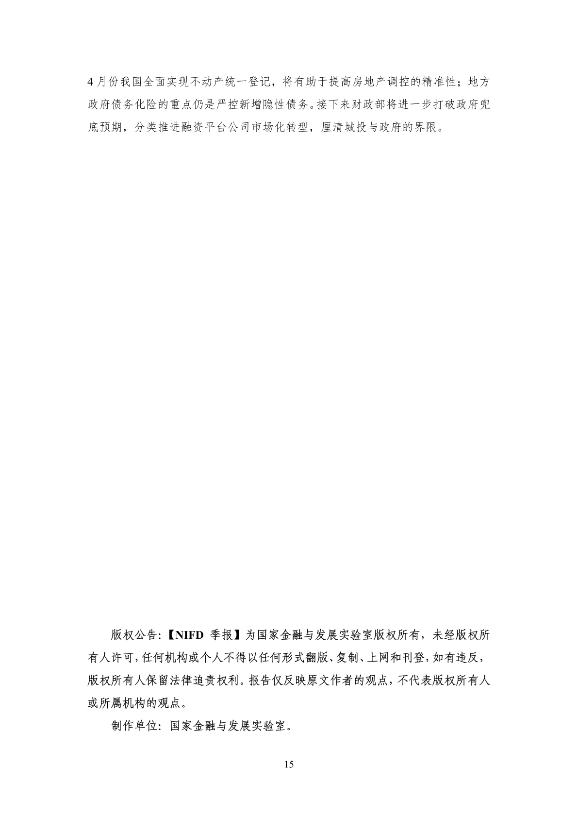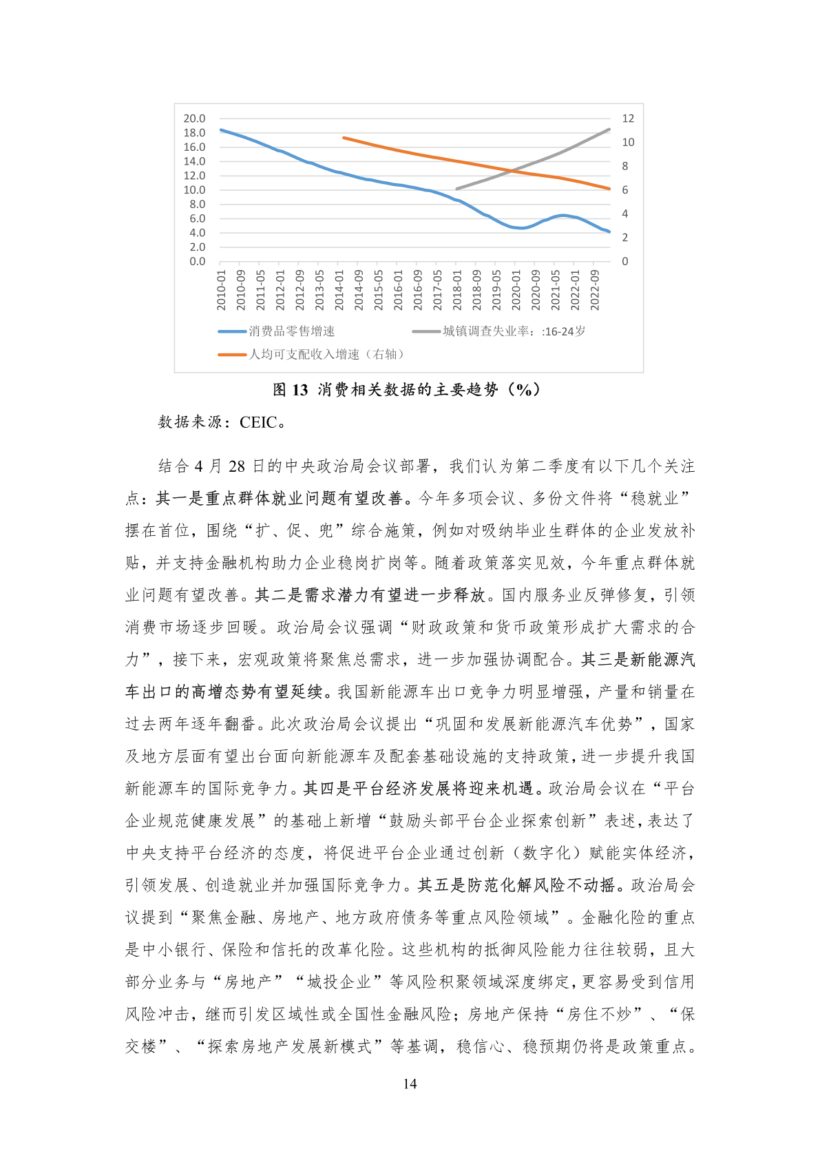 根据 4 月份中央政治局会议部署,第二季度的重点群体 就业问题有望改善,需求潜力有望进一步释放,新能源汽车 出口的高增态势有望延续,平台经济发展将迎来机遇,防范 化解风险仍不动摇。