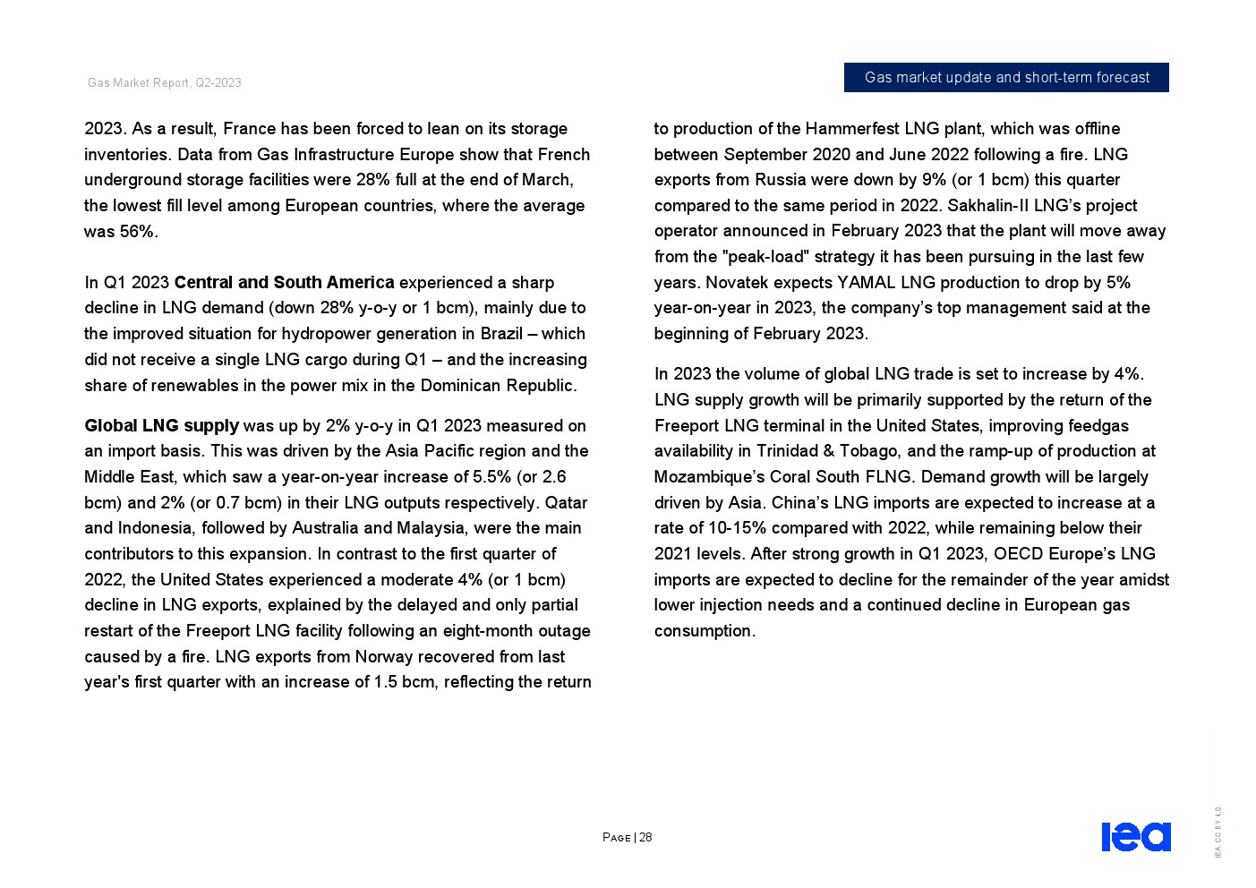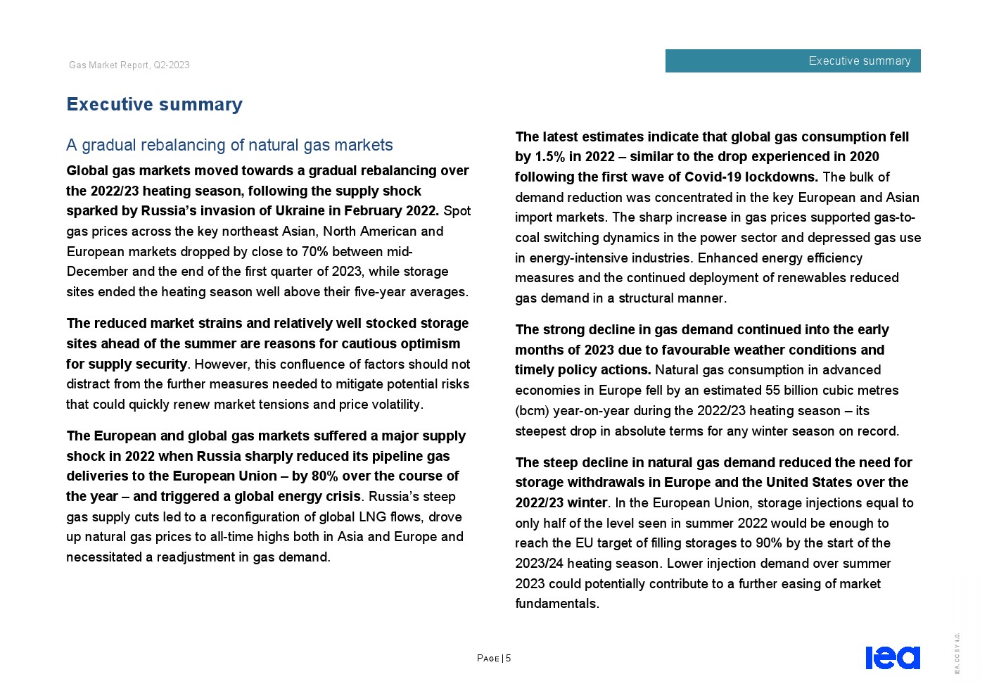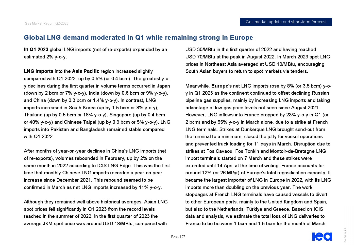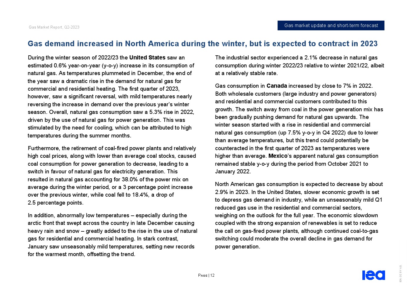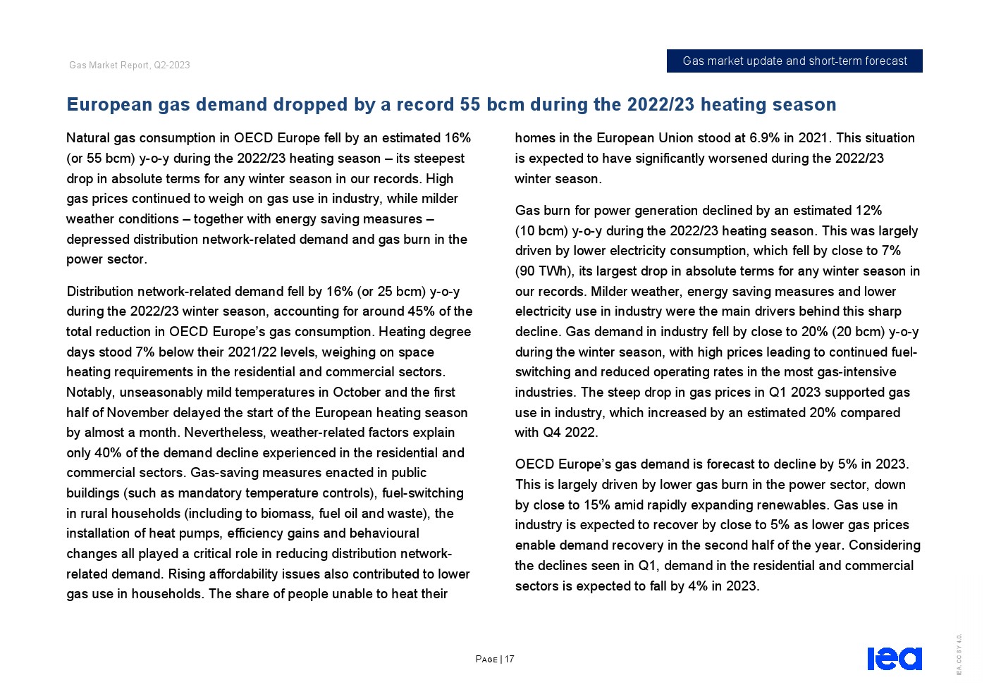 IEA发布了“2023年第二季度天然气市场报告”。全球天然气市场在2022/23供暖季逐渐走向再平衡。从2022年12月中旬到2023年第一季度末,东北亚、北美和欧洲主要市场的现货天然气价格下跌了近70%,而储气库在供暖季结束时远高于五年平均水平。