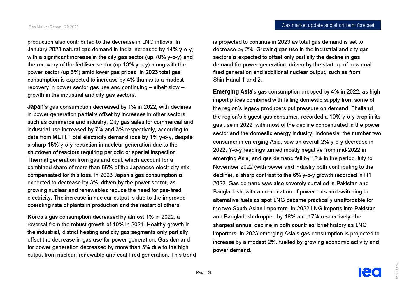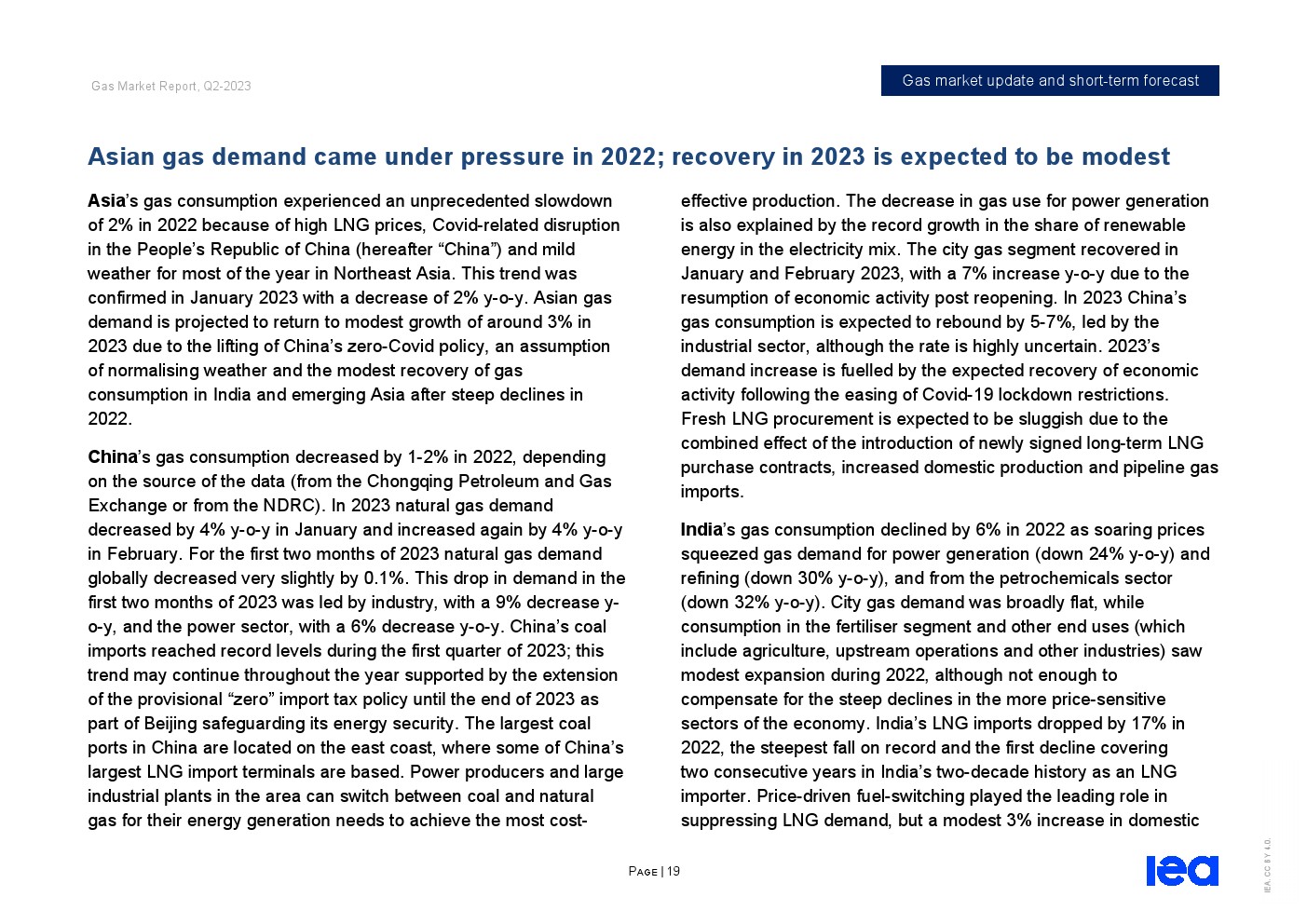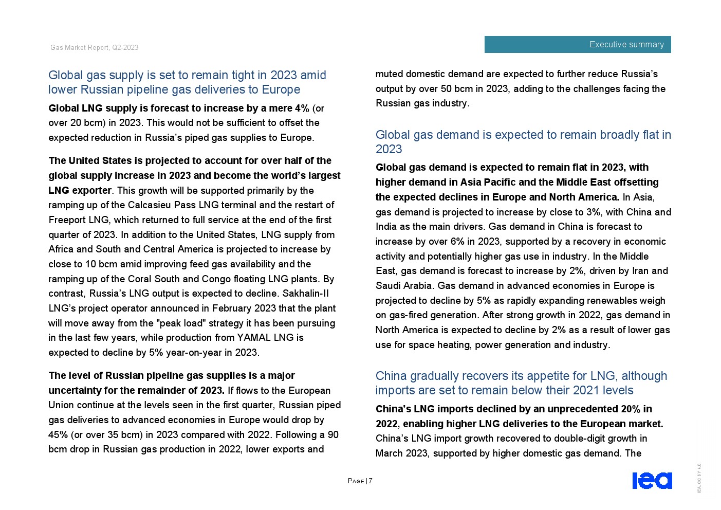 亚太和中东的需求增加抵消了欧洲和北美的预期下降。在亚洲,天然气需求预计将增长近3%,其中中国和印度是主要推动力。在经济活动复苏和工业用气可能增加的支持下,预计2023年中国天然气需求将增长6%以上。在伊朗和沙特阿拉伯的推动下,中东地区的天然气需求预计将增长2%。欧洲发达经济体的天然气需求预计将下降5%,因为可再生能源的迅速扩张给燃气发电带来了压力。在经历了2022年的强劲增长之后,由于空间供暖、发电和工业天然气使用量减少,北美的天然气需求预计将下降2%。