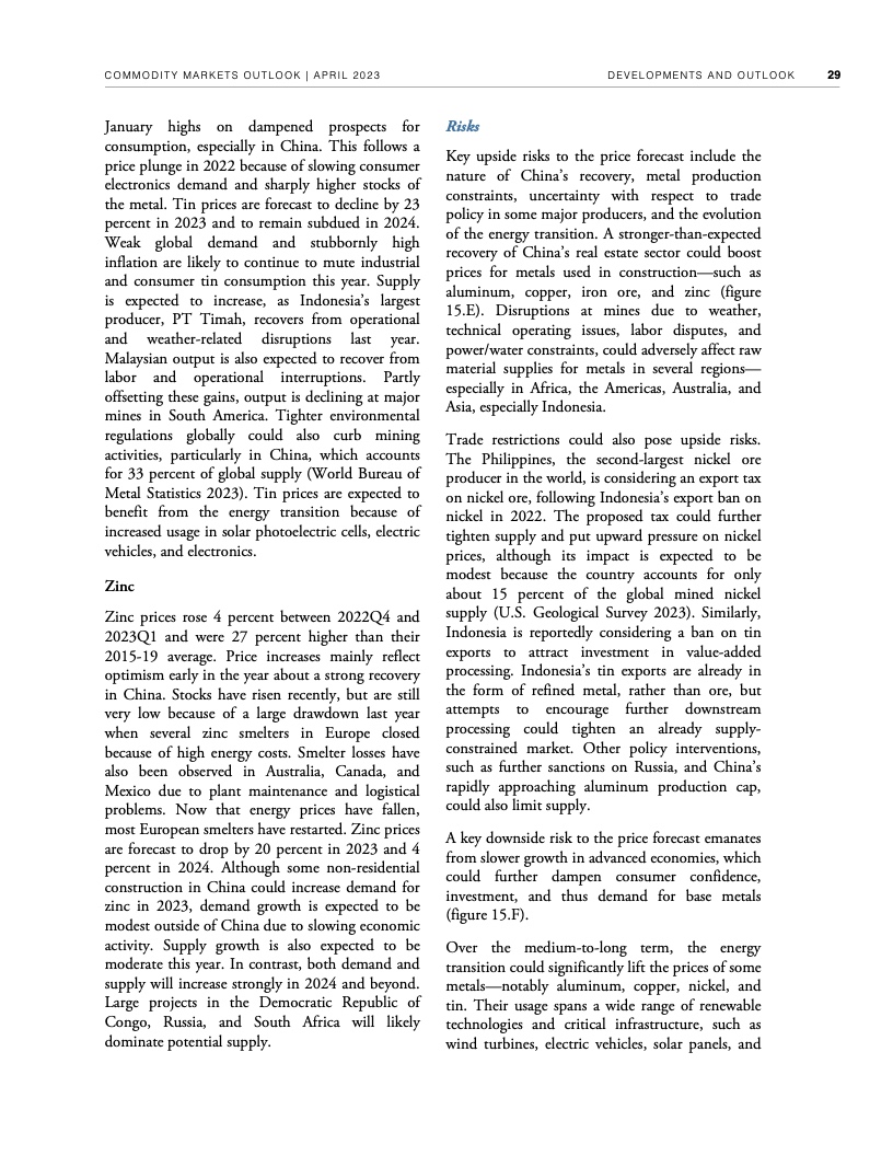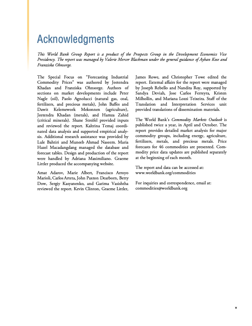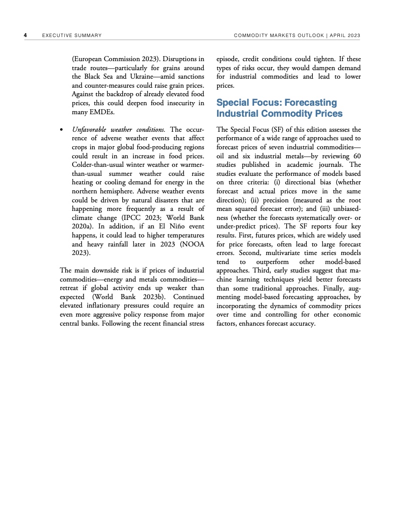 报告的“特别聚焦”部分评估了用于预测七种工业大宗商品(石油和六种工业用金属)价格的几种方法的表现。研究发现,期货价格被广泛用于价格预测,但往往会导致巨大的预测误差。基于多个独立变量的计量经济学模型的表现往往优于其他方法以及期货价格。研究结果表明,可采用一种基于模型的强化型预测方法来提高预测准确性,该方法纳入大宗商品价格随时间变化的动态情况,同时控制其他经济因素的影响。