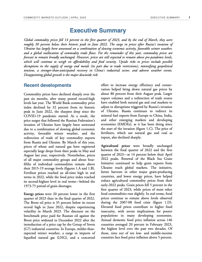 据世界银行首席经济学家兼发展经济学高级副行长英德米特•吉尔称,由于经济增长放缓、温和的冬季以及大宗商品贸易的重新分配,俄乌冲突发生后粮食和能源价格的飙升已基本结束。但这一消息对于众多国家的消费者来说,并不能带来太多的慰藉。以实际价值计算,现在是过去50年中粮食价格最高的时期之一。各国政府应该避免实施贸易限制,而采用针对性的收入支持计划来保护最贫困的人,而非施加价格管制。