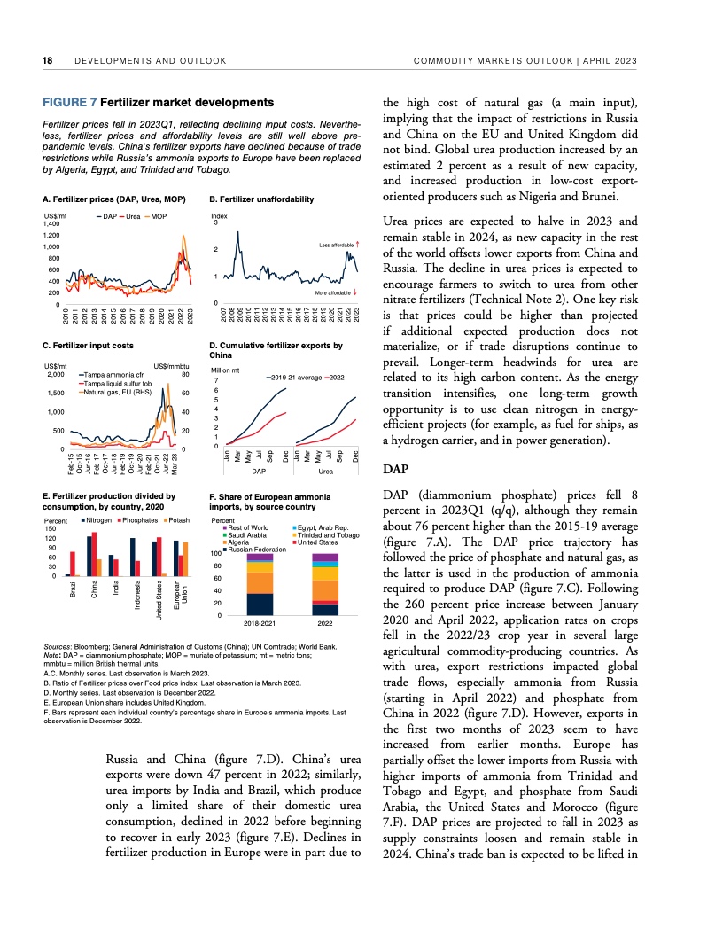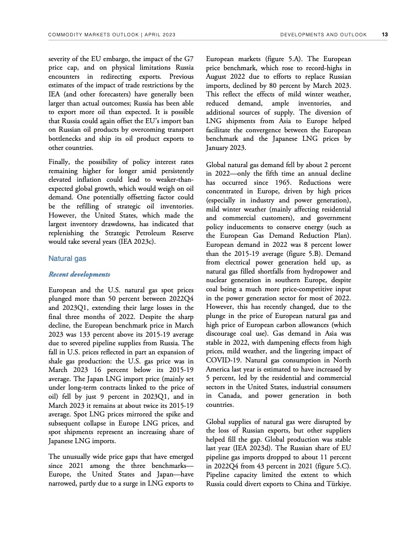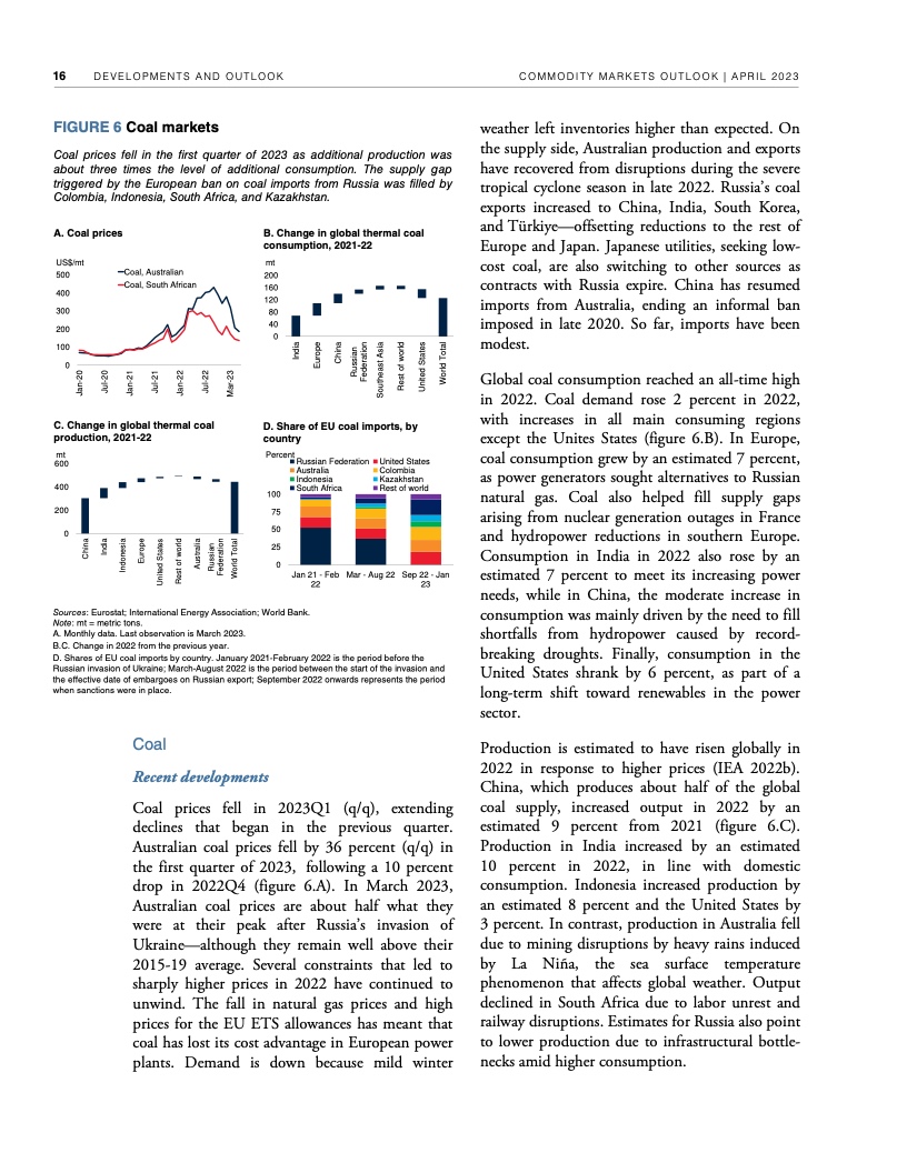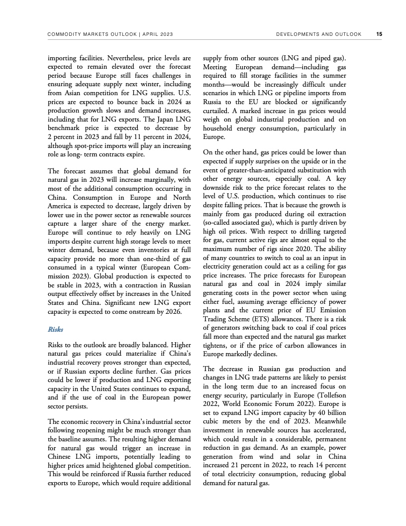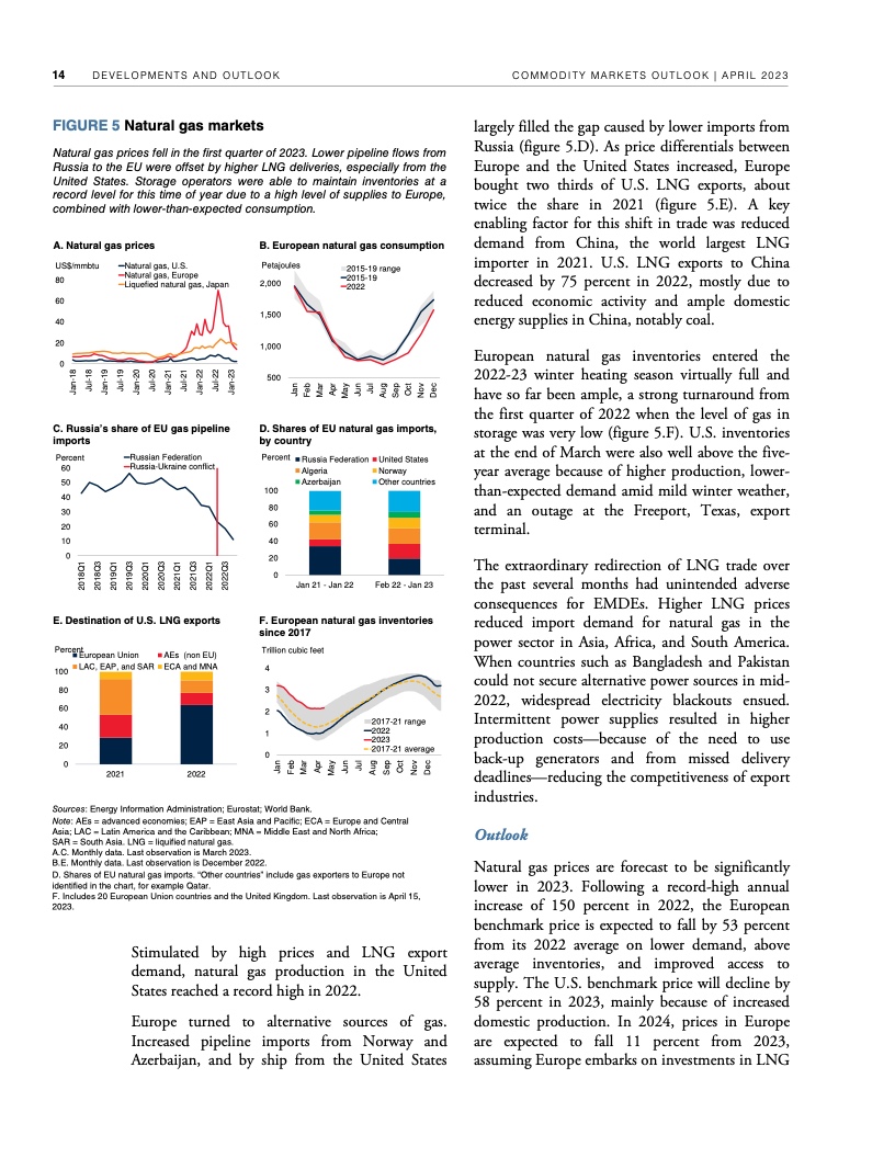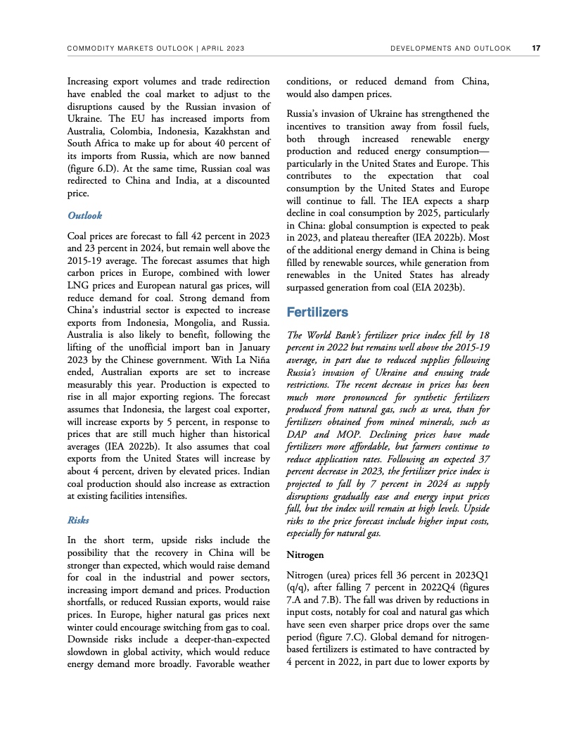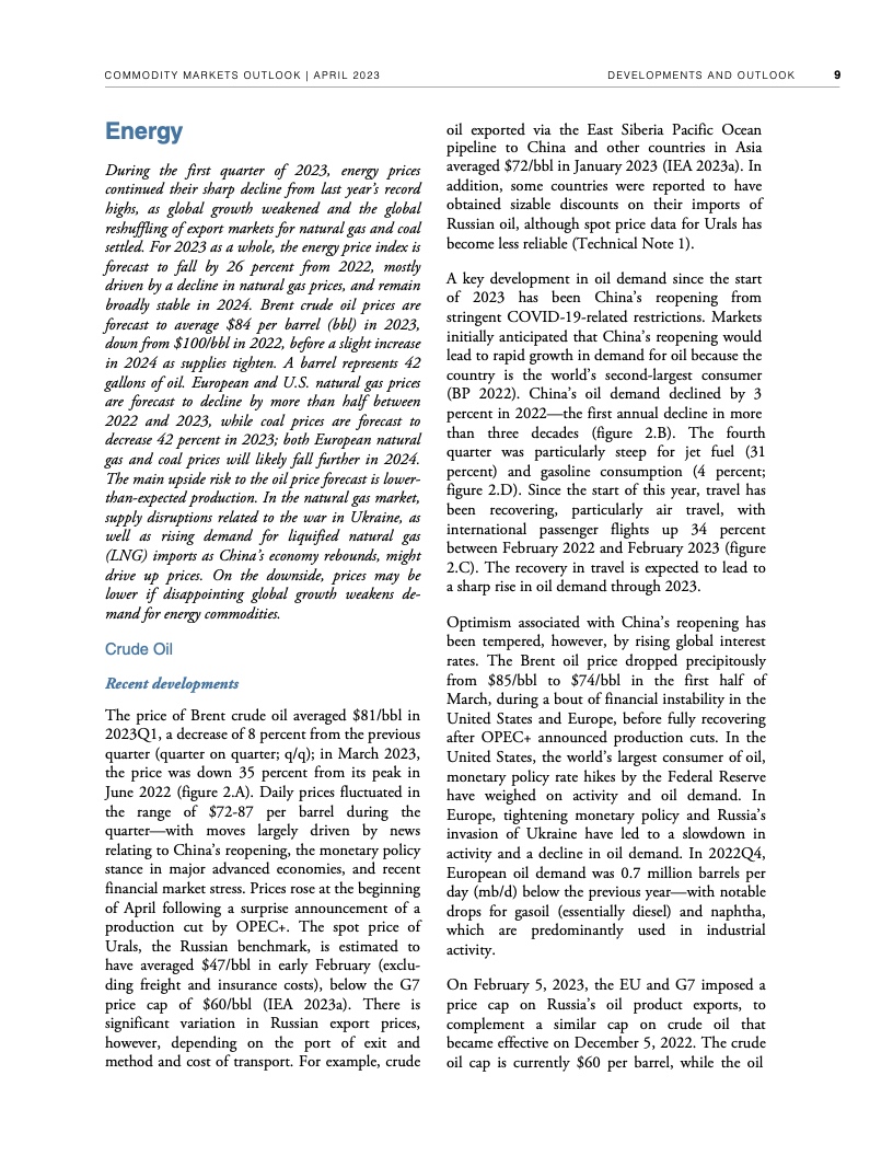 整体而言,2023年大宗商品的价格预计将会比去年下降21%。能源价格方面,今年预计将下降26%;以美元计价的每桶布伦特原油平均价格预计为84美元,下降幅度达16%。与2022年相比,2023年预计欧美天然气价格将减半,煤炭价格预计降低42%。化肥价格预计降37%,为1974年以来最大降幅。不过,化肥价格仍接近2008-09年粮食危机时期的高点。