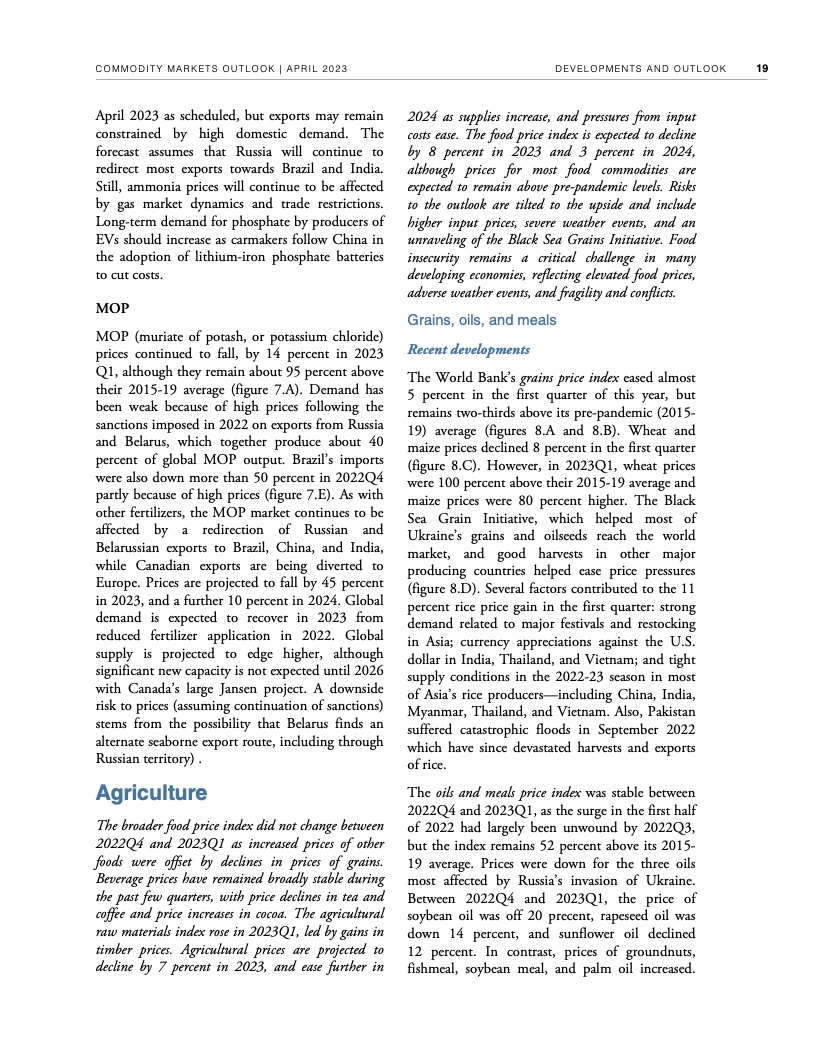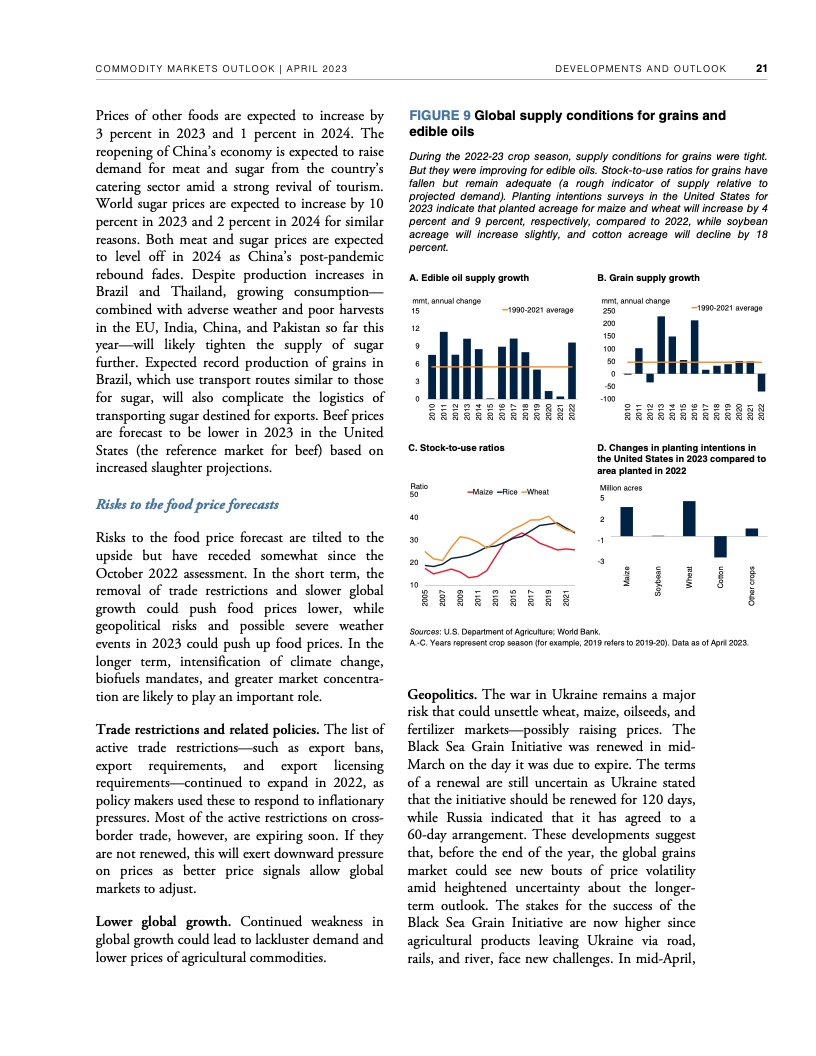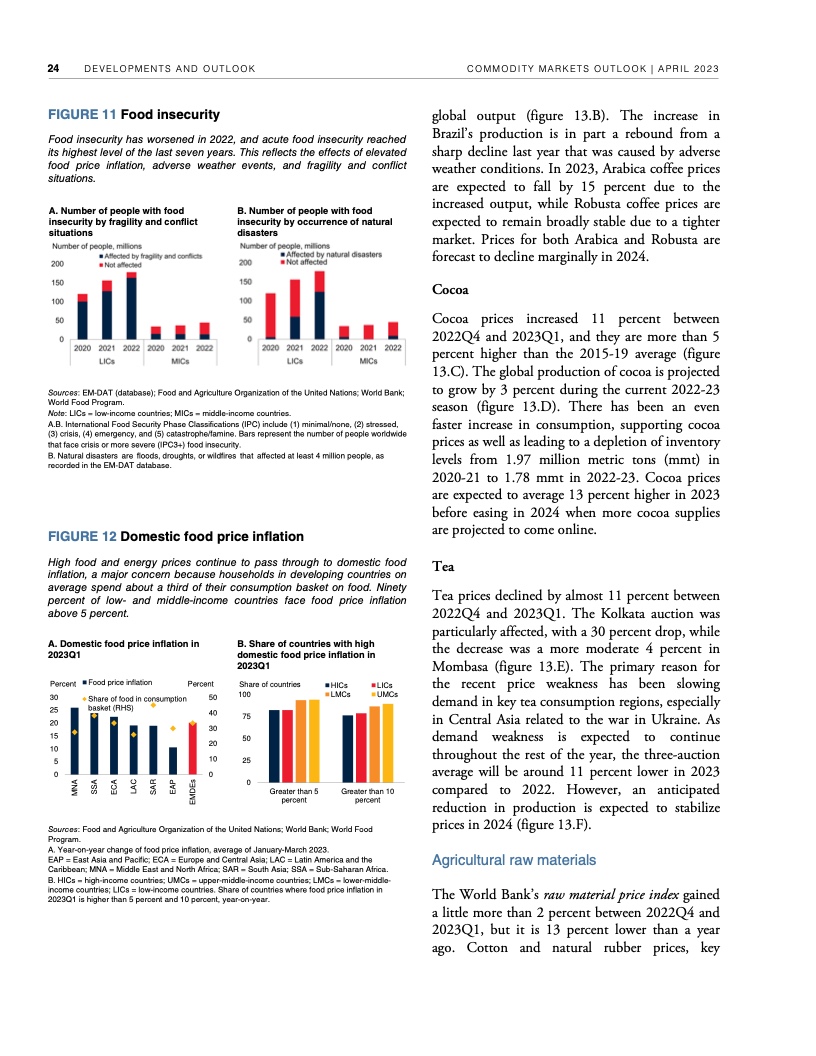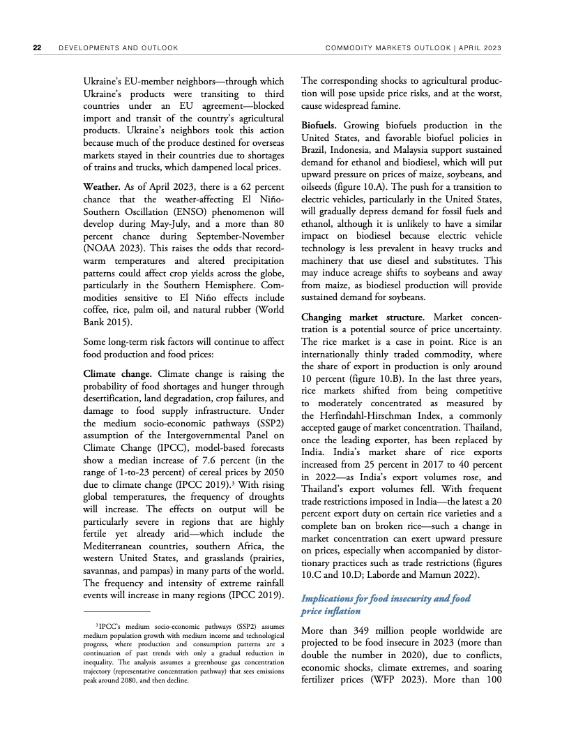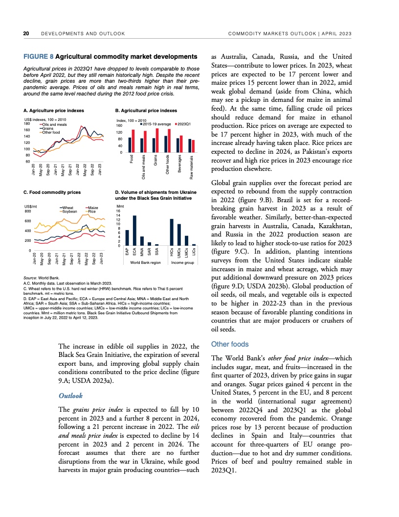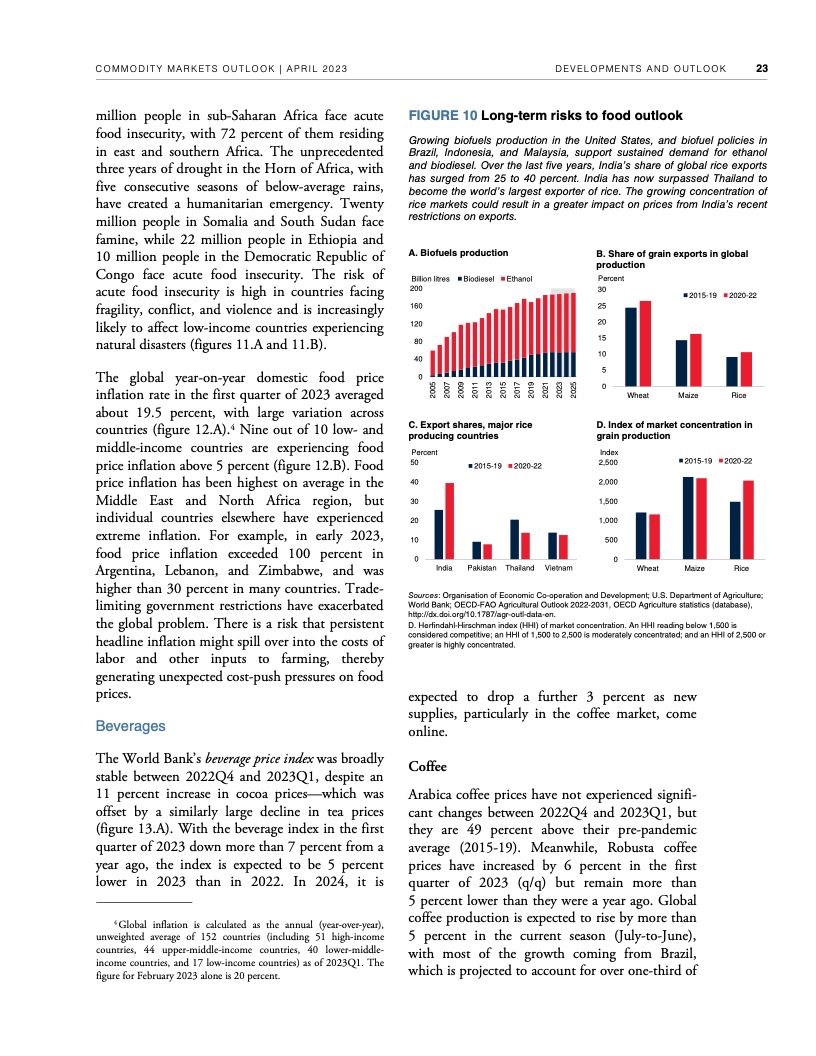 然而,预计大宗商品价格的下跌几乎不会缓解全世界面临粮食不安全问题的近3.5亿人口的境况。虽然2023年粮食价格预计将下降8%,但仍将处于1975年以来的第二高位。此外,截至今年2月,全球年度粮食价格上涨了20%,是过去20年来的最高涨幅。