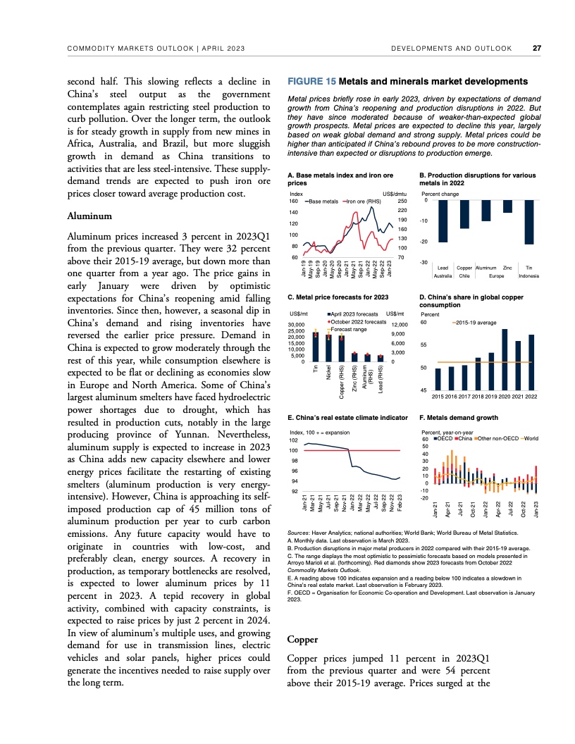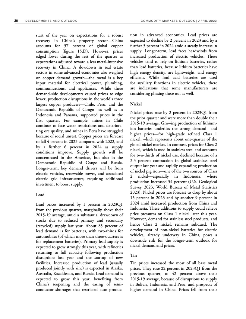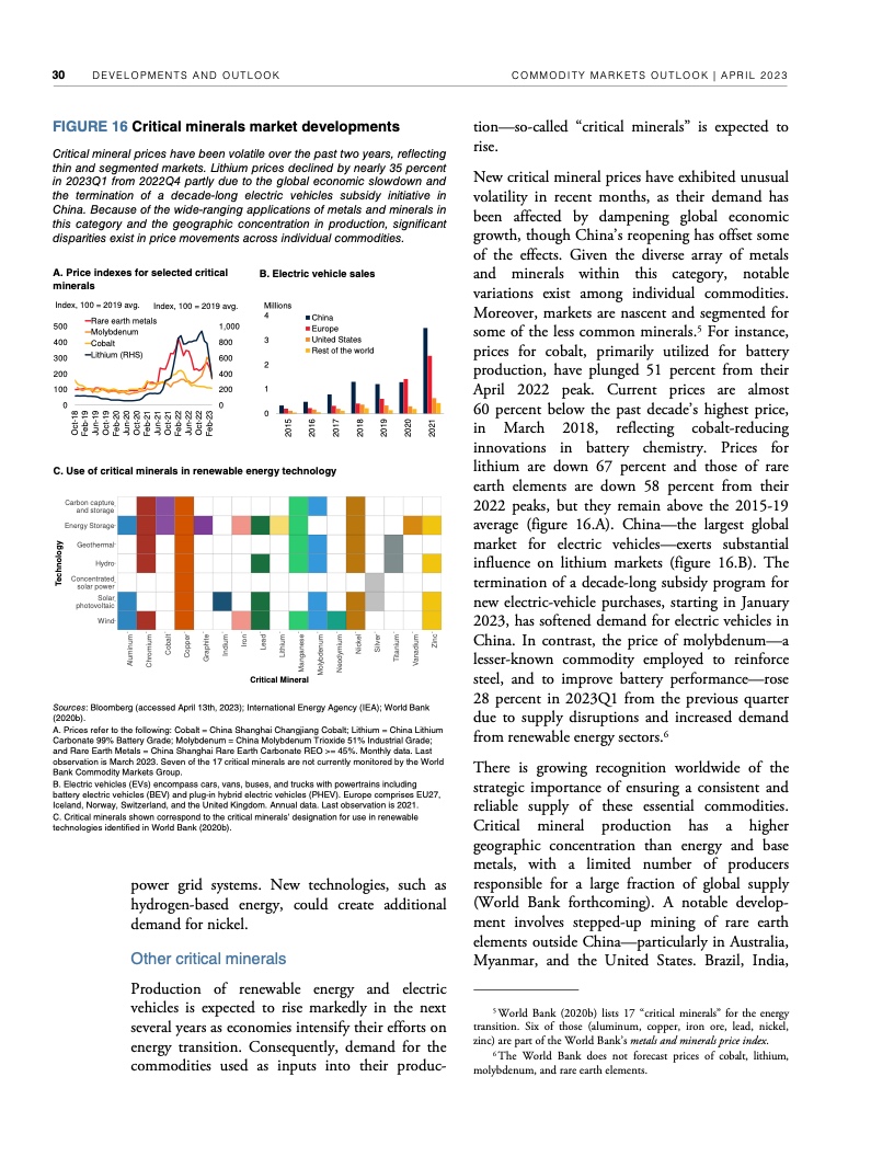 据世界银行预测局首席经济学家瓦莱丽·默瑟-布莱克曼表示,今年金属价格年初略上涨,但全年预计将下跌8%左右,主要原因是全球需求疲软和供应改善。然而,从长期来看,能源转型可能会在锂、铜、镍等金属市场上带来巨大需求。