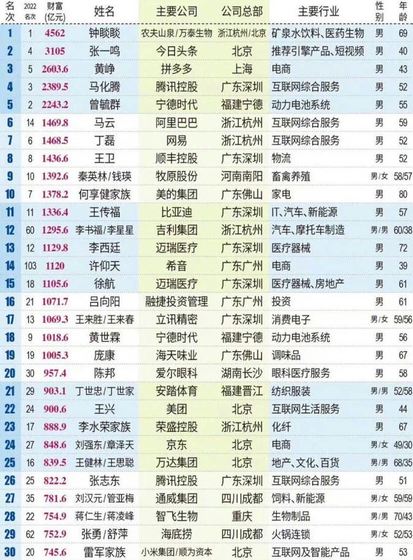 近日,《2023新财富500富人榜单》正式发布。根据新财富的统计,目前中国排名前十的富豪分别为钟睒睒、张一鸣、黄铮、马化腾、曾毓群、马云、丁磊、王卫、秦英林/钱瑛、何享健家族。其中,排名第十的何享健家族财富为1378.2亿元人民币。排名前十的富豪中,有七人的财富相比2022年有所下跌。