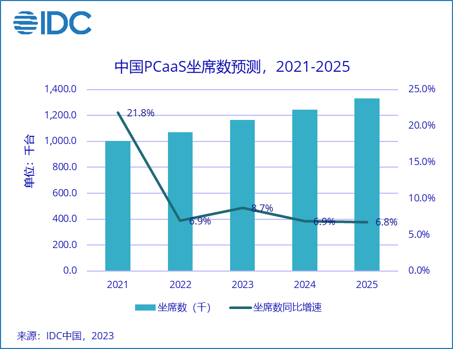 随着技术的不断进步和产业升级,企业对于PC设备的需求量和多样化程度进一步提高,这对于企业来说是一个重大的挑战。PCaaS由于能将企业转至 “轻资产”模式,降低企业IT成本,提升企业运营效率,该模式不断被更多的企业所接受。预计2023年中国PCaaS坐席数将达到1,170万,同比增长8.7%。