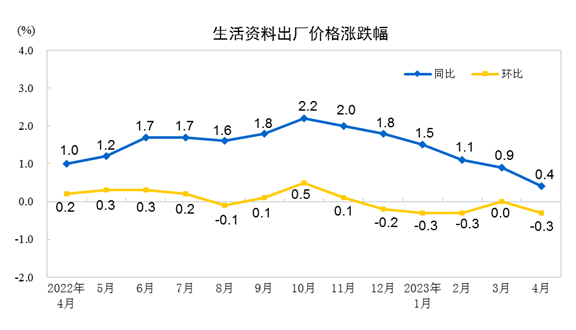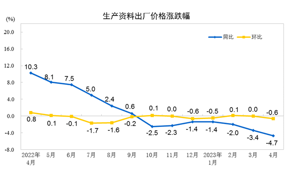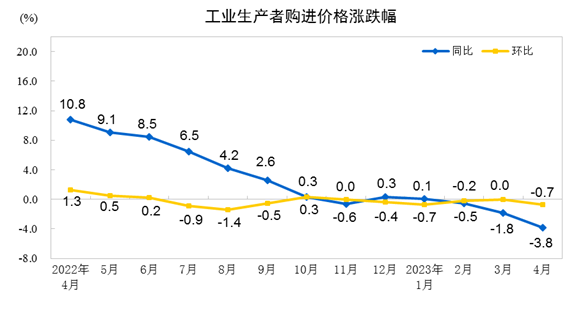 2023年4月份,全国工业生产者出厂价格同比下降3.6%,环比下降0.5%;工业生产者购进价格同比下降3.8%,环比下降0.7%。1—4月平均,工业生产者出厂价格比去年同期下降2.1%,工业生产者购进价格下降1.5%。
