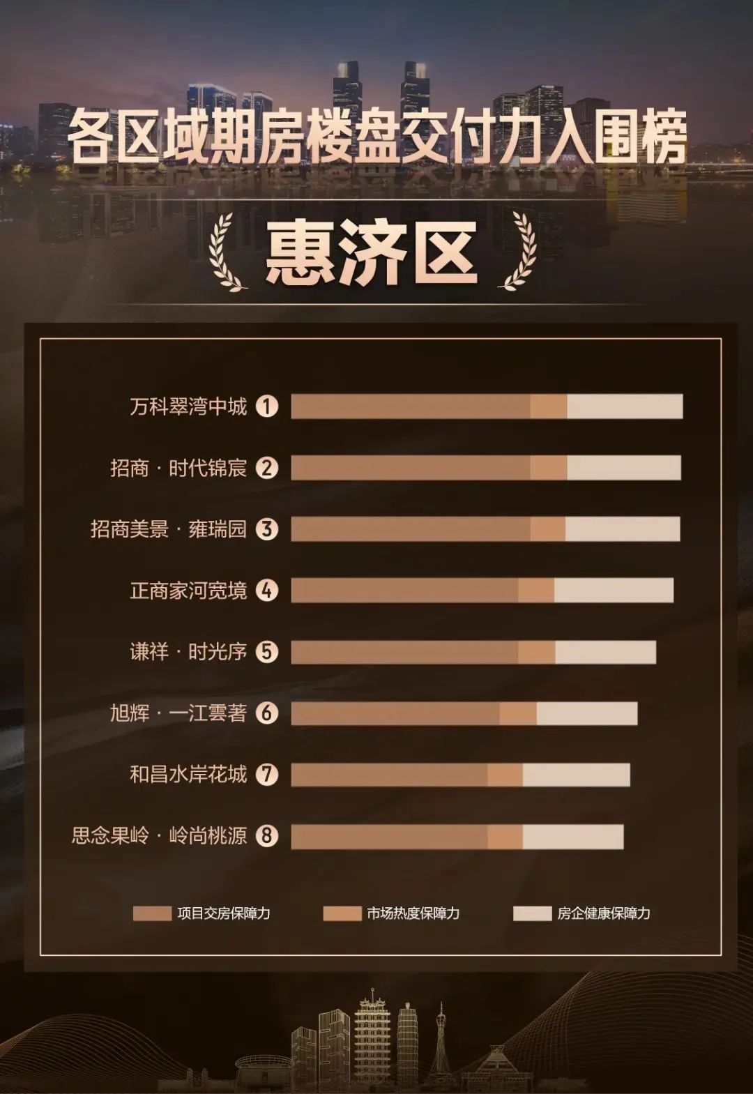 保利文化广场和保利和光屿湖双盘入围,保利品牌实力可见一斑。碧桂园·云顶、融信朗悦时光之城二期已结构封顶,工程进展较快,拉升交付力信心指数。