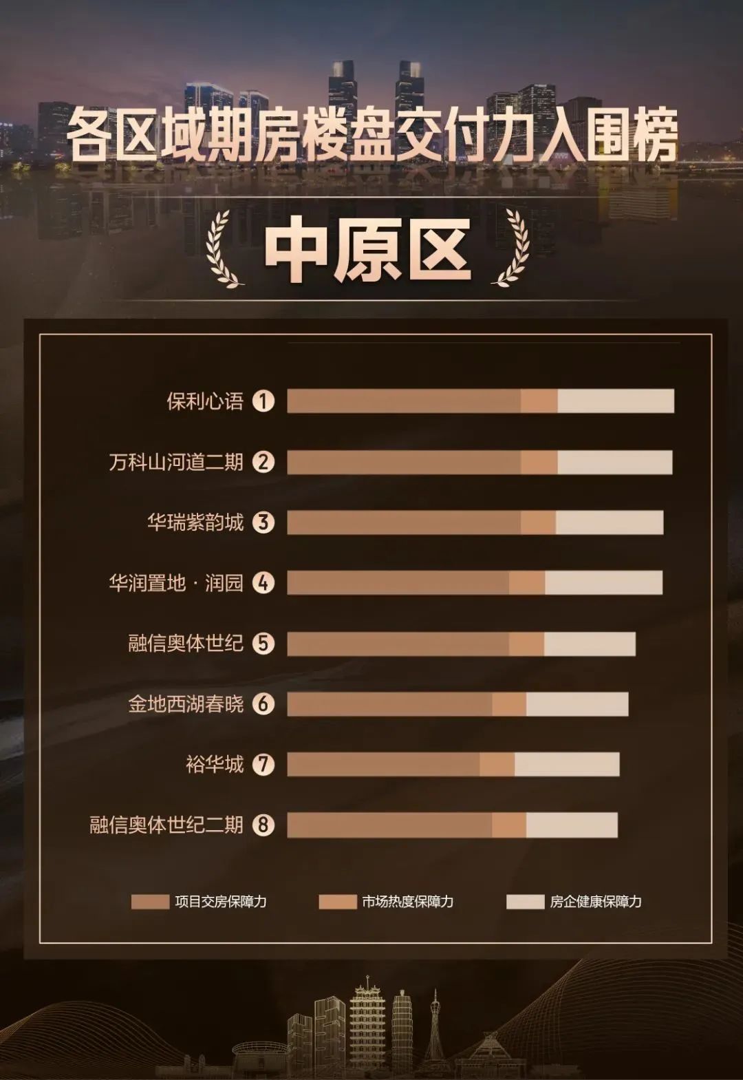 中原老城的保利心语和华润置地·润园凭借央企强大基因,稳居榜单前两名。新入市的万科山河道二期作为中原区为数不多的改善楼盘,在找房热度、房企稳健力和施工进度三方面优秀得很均衡。此外,常西湖片区的华瑞紫韵城项目进度基本进入尾声,交付指数占优。