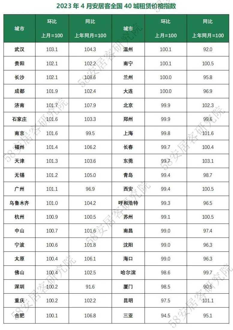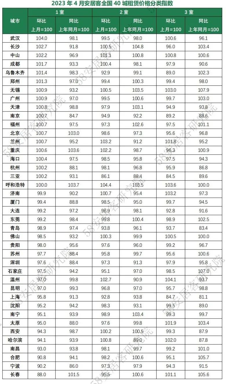 根据安居客4月40城租赁价格指数,全国40城中22个城市租赁价格环比指数温和上涨,16个城市价格环比指数小幅下跌。一线城市本月租赁环比价格指数表现较上月持平。仅武汉、三亚本月环比价格波动超过3%。