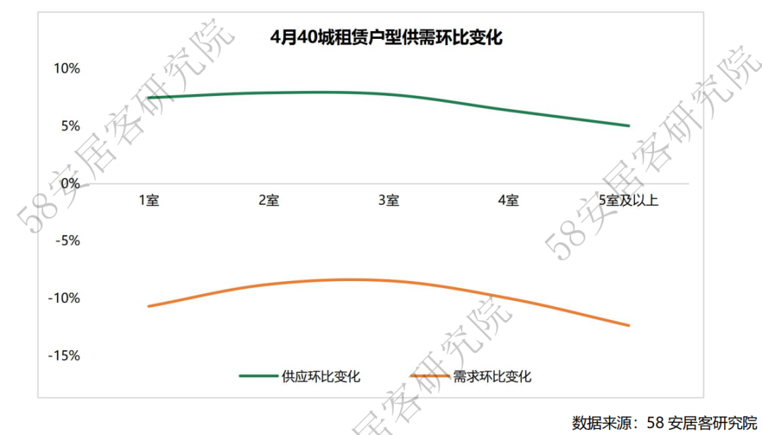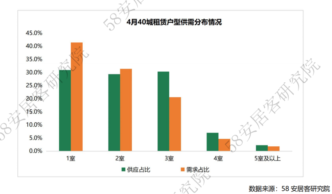 4月,全国40城租赁户型供需分布结构环比变化较小。户型的供应格局基本无变化。需求方面,由于春季租赁旺季的结束,市场对一室户型的需求下降。本月一室需求占比环比持续下降0.5%,而两室和三室的需求占比均小幅上升0.3%。市场对两室和三室需求延续了上升趋势,在一定程度上,今年市场租赁需求更凸显性价比。