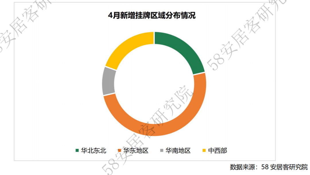 结合4月新增挂牌的区域结构分布来看,新增挂牌量较上月小幅收缩,但各区域间挂牌量分布占比波动加大。其中,华东区域占比上升1.4%,本月供应占比达到50.0%;华南区域占比继续下降1.0%,本月占比已不足10%。华北东北占比下降0.4%,供应占比达到21.4%。中西部占比与上月持平,仍为19.5%。