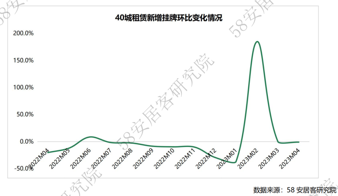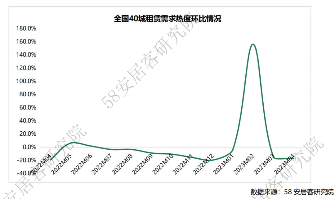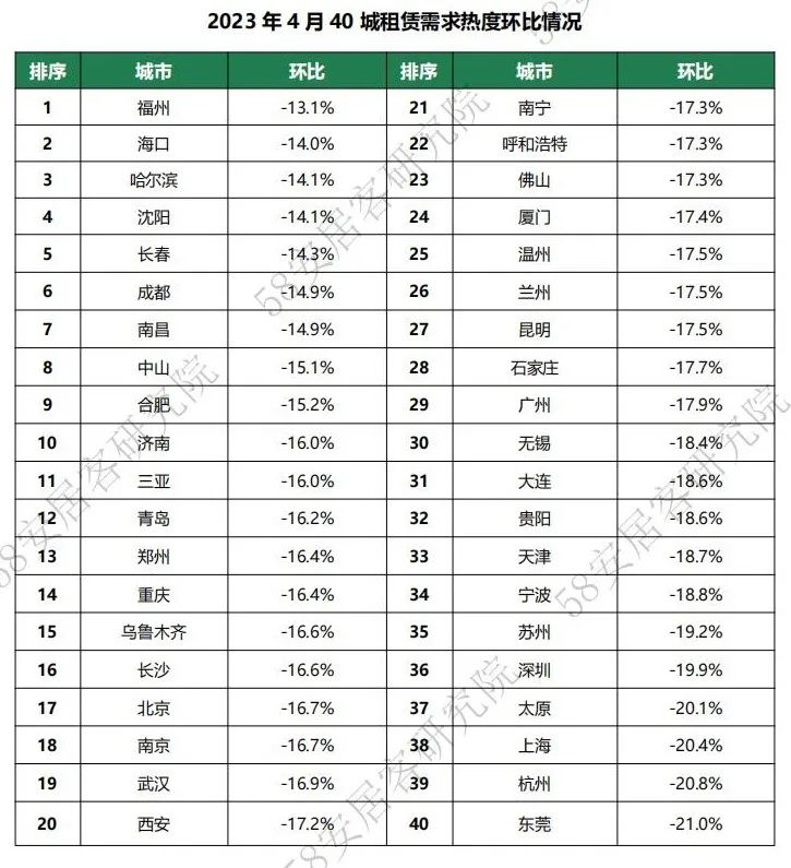 4月,全国40城租赁新增挂牌房源供应量环比下跌1%。全国40城租赁市场需求呈现普遍回落,整体需求热度环比下降17.1%。