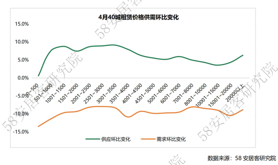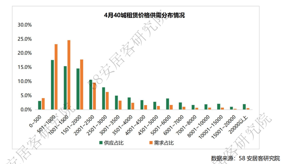 从4月全国40城租赁价格供需分布来看,市场整体的价格供需格局波动较小。中低价位供需仍占主导,501~2500元/月/套的供应占比达到58.2%,占比上升0.4%;对应的价格段的需求占比与上月持平,仍为75.2%。