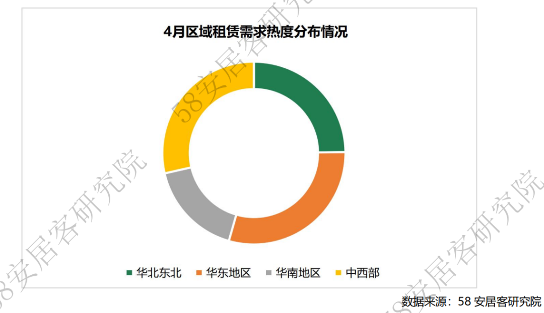 从4月各区域租赁需求结构分布来看,华北东北和中西部需求占比均小幅上升0.2%,分别达到24.8%、24.6%,华东地区本月占比小幅下降0.2%至29.6%,仍为四个区域中最高。对比租赁挂牌供应来看,市场需求分布相对更均衡。