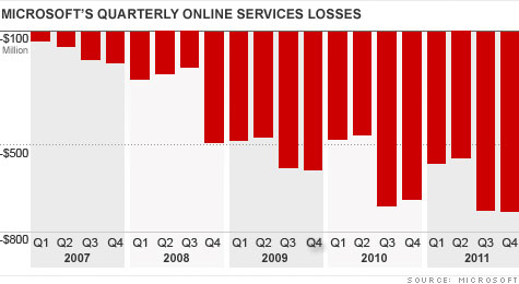 根据CNN,自从2009年推出搜索引擎Bing以来,微软已经损失了55亿美元,从上图可以看出,现在Bing一季度损失将近10亿美元。