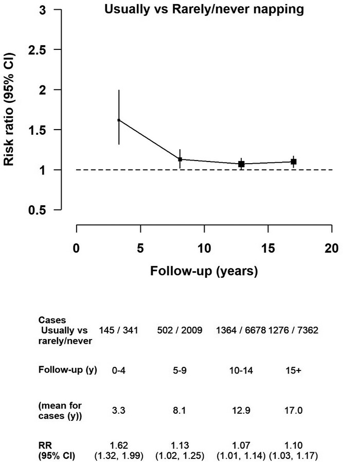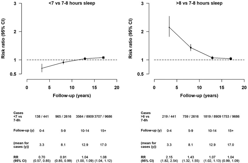 相较正常睡眠时间,在前5年中,睡眠时间较长参与者的痴呆风险高达2.15倍,但是在第15年之后,风险比已经非常接近1。