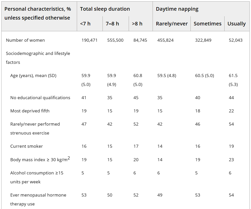从分布上来看,睡眠时间较短或较长、会小睡的参与者更有可能年纪较大、学历较低、BMI较高、吸烟、进行过更年期激素治疗、没有有偿工作,而且自我评价的健康状况也比较差。