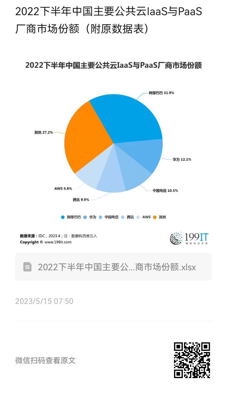 - IDC:2022年下半年中国公有云服务整体市场规模(IaaS/PaaS/SaaS)达到188.4亿美元