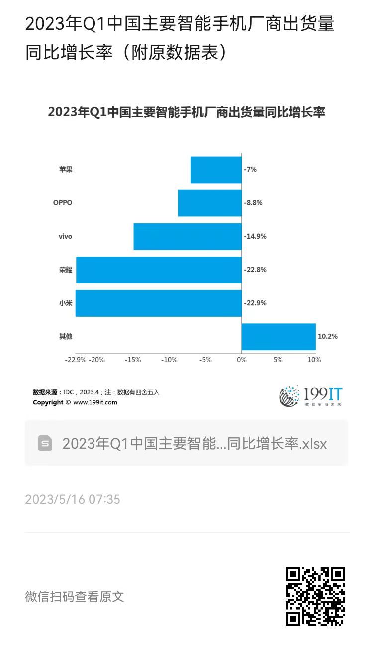 2023年Q1中国主要智能手机厂商出货量同比增长率(附原数据表) ​​​