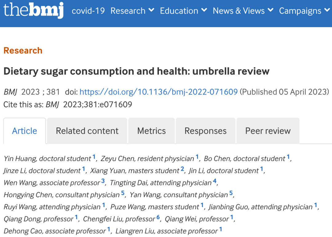 [1].Huang Y, Chen Z, Chen B, et al. Dietary sugar consumption and health: umbrella review. BMJ. 2023;381:e071609. Published 2023 Apr 5. doi:10.1136/bmj-2022-071609