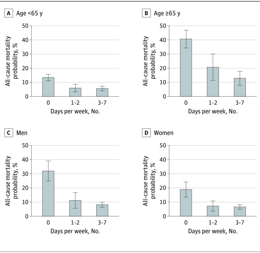 [3].Dos Santos M, Ferrari G, Lee DH, et al. Association of the “Weekend Warrior” and Other Leisure-time Physical Activity Patterns With All-Cause and Cause-Specific Mortality: A Nationwide Cohort Study. JAMA Intern Med. 2022. doi:10.1001/jamainternmed.2022.2488