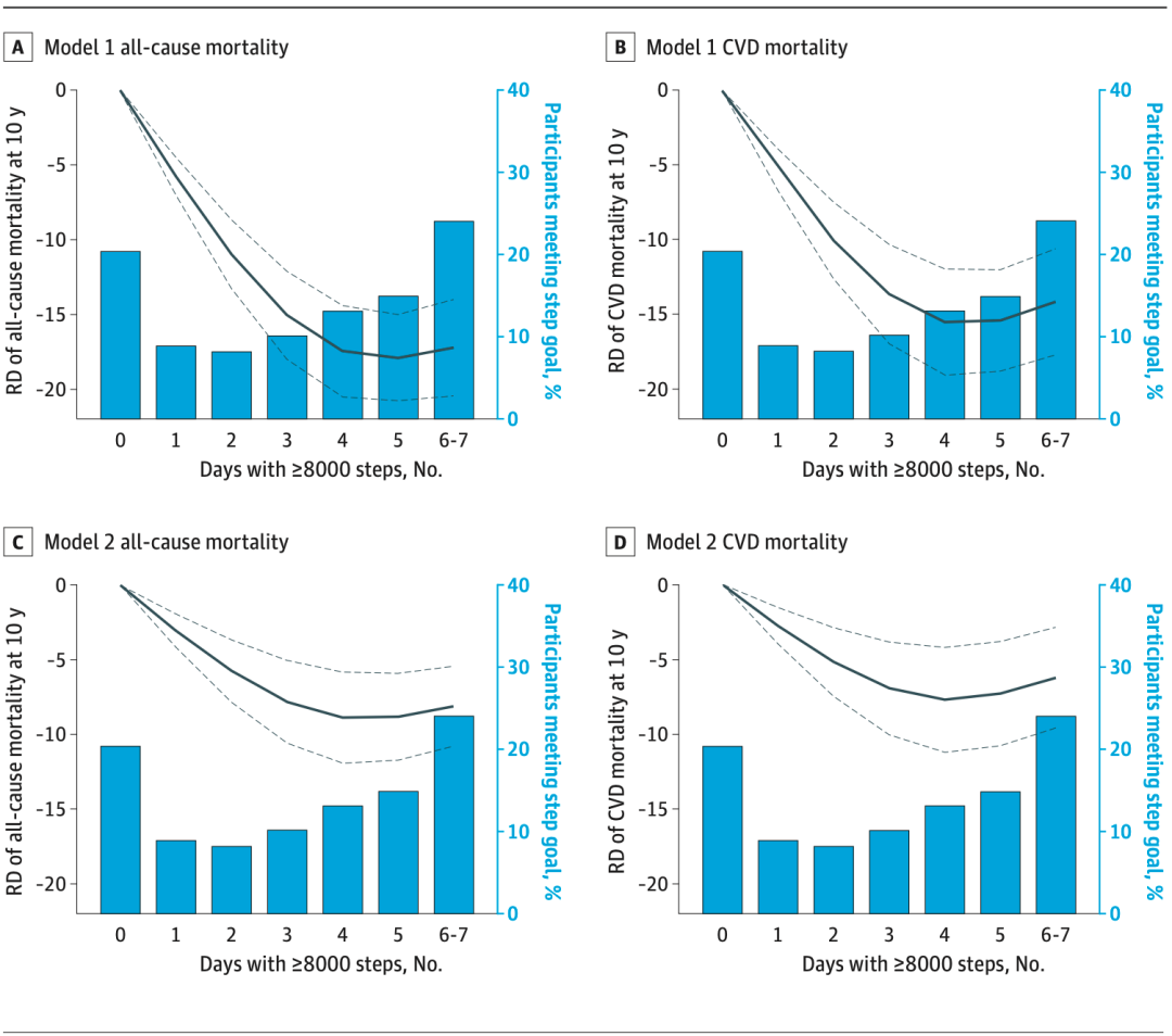 总的来说,这项基于美国成年人的队列研究表明,一周内走8000步或以上的天数与10年后的全因和心血管死亡风险降低有关。