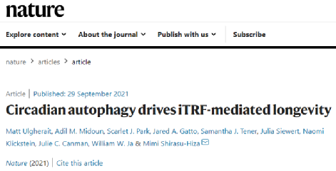 [1] Ulgherait M, Midoun AM, Park SJ, Gatto JA, Tener SJ, Siewert J, Klickstein N, Canman JC, Ja WW, Shirasu-Hiza M. Circadian autophagy drives iTRF-mediated longevity. Nature. 2021 Oct;598(7880):353-358. doi: 10.1038/s41586-021-03934-0. Epub 2021 Sep 29. PMID: 34588695; PMCID: PMC9395244.