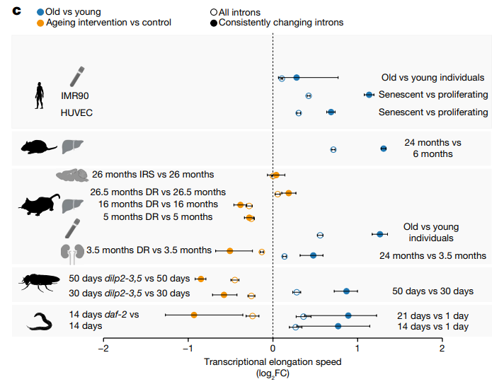 近期,德国科隆大学、马克斯普朗克衰老生物学研究所在Nature上发表了一篇题为” Ageing-associated changes in transcriptional elongation influence longevity “的研究论文,他们发现基因的平均转录延伸速度会随着年龄的增长而增加,这会导致转录易出错、转录质量降低,最终机体衰老;而限制饮食可以减缓基因的转录速度,从而延长10-20%的寿命。