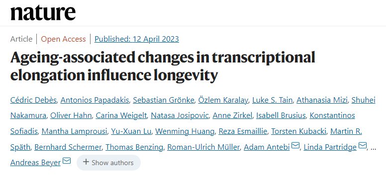 [2] Debès C, Papadakis A, Grönke S, Karalay Ö, Tain LS, Mizi A, Nakamura S, Hahn O, Weigelt C, Josipovic N, Zirkel A, Brusius I, Sofiadis K, Lamprousi M, Lu YX, Huang W, Esmaillie R, Kubacki T, Späth MR, Schermer B, Benzing T, Müller RU, Antebi A, Partridge L, Papantonis A, Beyer A. Ageing-associated changes in transcriptional elongation influence longevity. Nature. 2023 Apr 12. doi: 10.1038/s41586-023-05922-y. Epub ahead of print. PMID: 37046086.