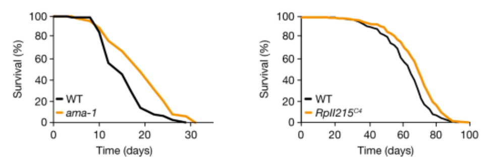 在座的一定想问了,Pol II的延伸速度加快真的会让人变老吗?其实不仅大家存有疑虑,研究人员们也对此饶有兴趣。为了证明这二者存在因果关系,他们在果蝇和线虫上进行了实验验证。