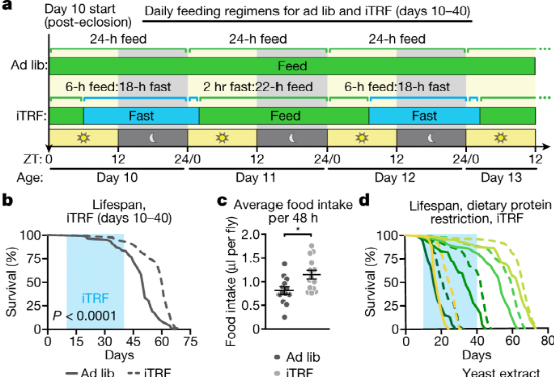 结果表明,在四种饮食模式中,只有iTRF显著延长了寿命。其中雌性果蝇寿命增加18%,雄性果蝇寿命增加13%。