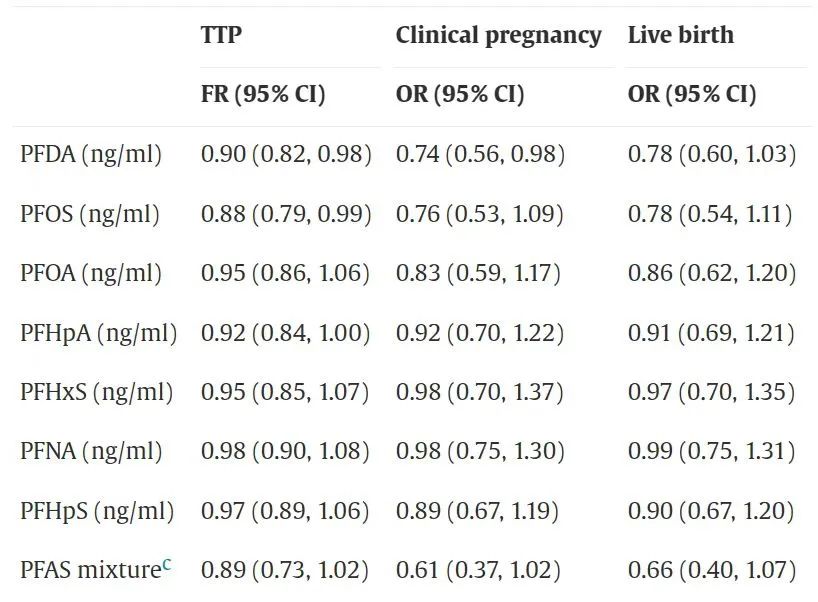 他们收集了参与者血浆中的PFAS,然后在6、9和12个月电话随访跟踪怀孕状况,以评估女性孕前血浆PFAS浓度与生育结果之间的关联。