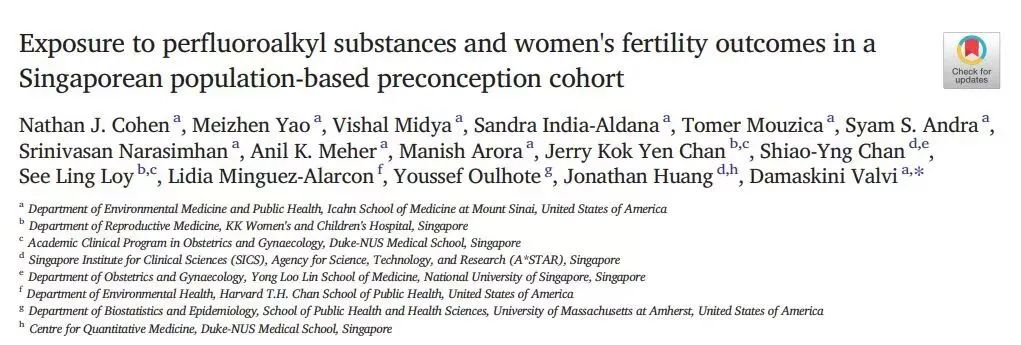 [1] Cohen NJ, Yao M, Midya V, India-Aldana S, Mouzica T, Andra SS, Narasimhan S, Meher AK, Arora M, Chan JKY, Chan SY, Loy SL, Minguez-Alarcon L, Oulhote Y, Huang J, Valvi D. Exposure to perfluoroalkyl substances and women’s fertility outcomes in a Singaporean population-based preconception cohort. Sci Total Environ. 2023 May 15;873:162267. doi: 10.1016/j.scitotenv.2023.162267. Epub 2023 Feb 17. PMID: 36801327.
