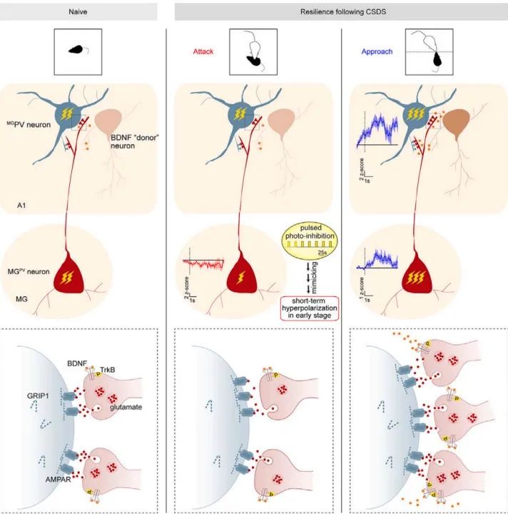 既往研究显示,BDNF-TrkB信号通路在突触发生中发挥重要作用。在本研究中,研究人员结合光遗传学等多种方法检测后发现,BDNF-TrkB信号通路可调控MG到A1中PV-INs突触传递数量,触发了心理弹性机制,从而增加了小鼠抵抗压力的能力。