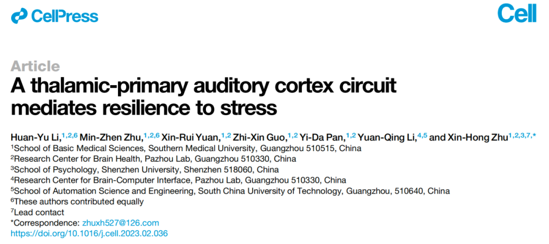 近期,南方医科大学朱心红教授团队利用慢性社交挫败抑郁(CSDS)模型,发现了一个主要听觉区的抗压微环路,即丘脑—初级听觉皮层(A1)环路,它能触发先天心理弹性机制。