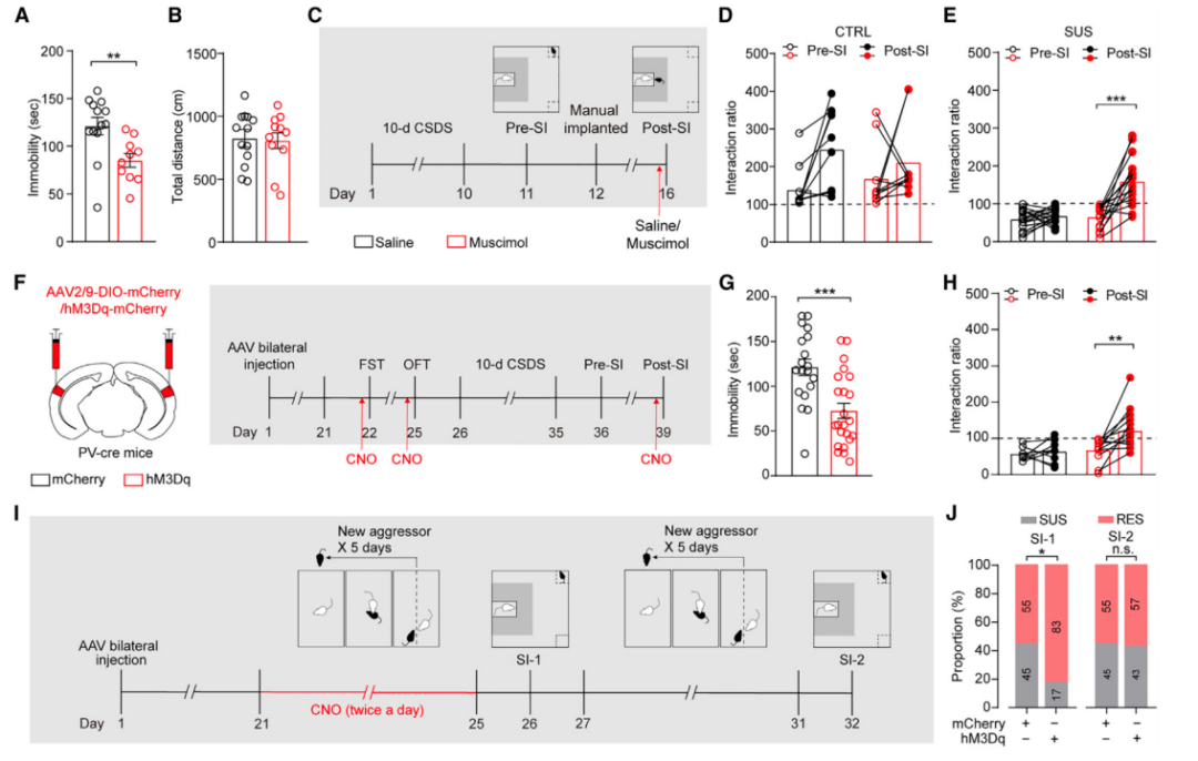 接下来,为了进一步确定A1中PV-INs的激活是否能产生抗抑郁样作用,研究人员先后用药理学和化学遗传学手段,人为模拟PV-INs的激活状态。结果发现,无论用哪种方法,PV-INs激活后,均可增强小鼠的抗压能力,如在强迫游泳测试(FST)中,出现不动时间减少的现象;在CSDS模型中,出现社交回避减少的现象。