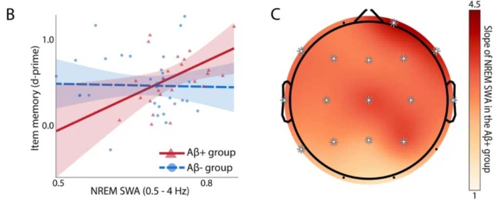 使用多元线性回归模型评估NREM SWA对记忆能力的预测,研究者发现这与Aβ负担显著相关,即在高Aβ负担参与者中,NREM SWA水平更高者项目记忆表现更好,而在Aβ负担低的参与者中并没有这样的关联。