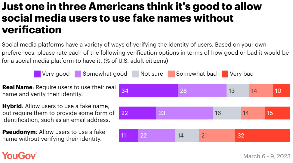 在 “允许用户匿名” 还是 “要求用户接受身份验证” 这一问题上,美国人更倾向于后者。大多数受访者(62%)认为,平台要求用户使用真实姓名并验证其身份是个好主意(“非常好”或“比较好”)。半数受访者(55%)认为应允许用户使用假名,同时要求他们提供某种形式的身份证明,如电子邮件地址。另有 33% 的受访者赞同无需身份验证的匿名制。