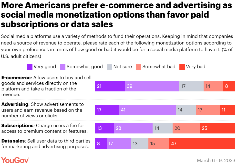 在历史上,广告占了社交媒体平台收入的大部分,而美国人普遍对此持认可态度。58% 的受访者认为,平台通过向用户投放广告赚钱是 “非常好” 或“比较好”的。仅 25% 的受访者赞同平台通过向第三方出售用户数据来盈利。一些社交媒体平台(如 Facebook 和 Pinterest)已经开通电子商务功能,并允许母公司从平台上买卖的商品和服务中抽成。美国人普遍对这种盈利模式持积极态度(60% 赞同,22% 反对)。此外,基于订阅的收入模式(即向用户收取高品质内容或功能的费用)则不那么受人欢迎(41% 赞同,45% 反对)。