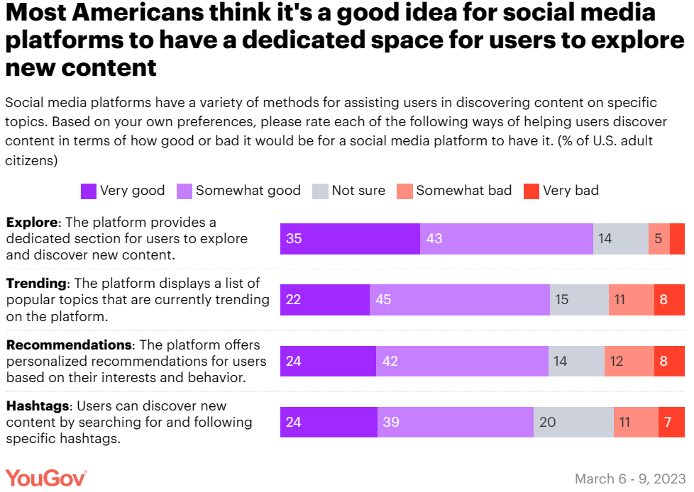 为了解美国人的社交媒体愿景,YouGov 公司邀请受访者对其理想中的社交媒体进行评分,评分指标涵盖内容呈现(presentation of content)、用户验证(user verification)、显性用户验证(notable user verification)、隐私设置(privacy settings)、内容审核(content moderation)、平台盈利(monetization)、内容发掘(content discovery)、用户参与(user engagement)及内容类型(type of content)九个维度,评分范围从 “非常好” 到“非常差”。以下是美国人眼中理想的社交媒体平台: