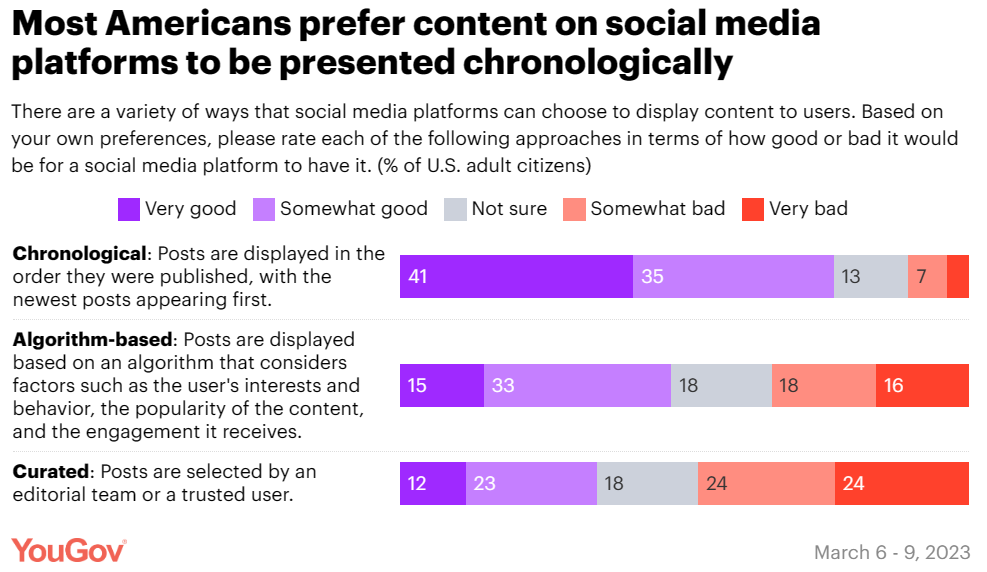 虽然大多数社交媒体平台默认通过算法机制推送内容,但最近有立法者和活动家建议,应要求平台为用户提供按时间顺序查看内容的选项——即按贴文的发布顺序推送内容。美国人更喜欢哪种方式?调查显示,受访者更喜欢按时间顺序推送,有 76% 的受访者认为平台按时间顺序呈现贴文 “非常好” 或“比较好”。