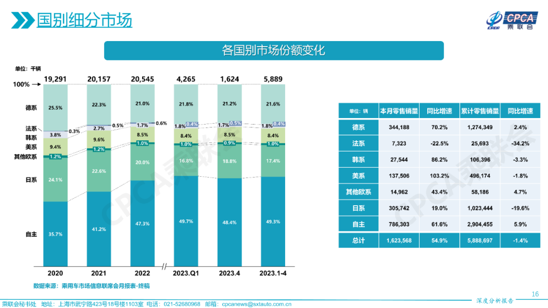 各国别不同车型大类增速、销量和份额——2023年4月及累计