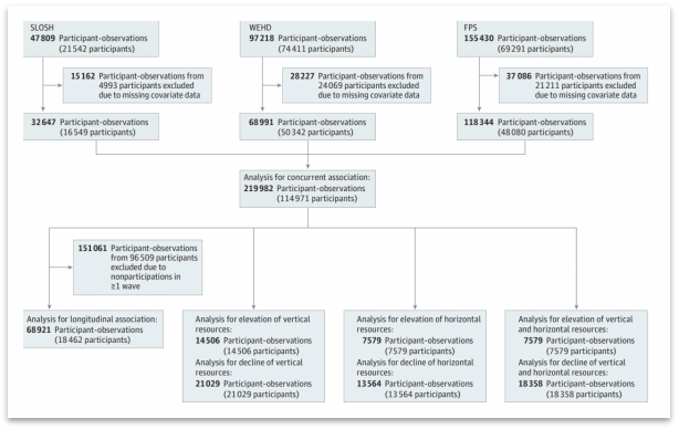 紧接着,研究者发现,在51259名参与连续两次随访的受试者中,27167名(53%)受试者经历了资源变化。纵向资源的变化占了大部分,其中8233名员工(16%)经历了纵向资源的改善,8130名员工(16%)经历了纵向资源的恶化。