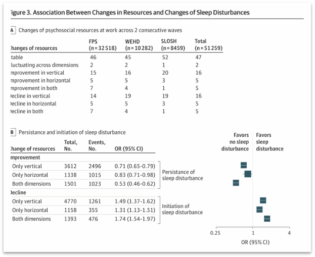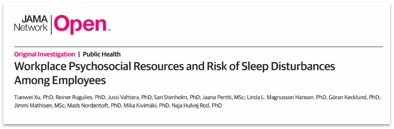 [1] Xu T, Rugulies R, Vahtera J, et al. Workplace Psychosocial Resources and Risk of Sleep Disturbances Among Employees. JAMA Netw Open. 2023;6(5):e2312514.