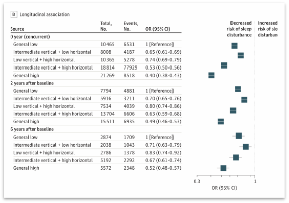 在7491名基线睡眠障碍患者中,5414人(72%)在2年后报告了睡眠障碍,3095人(41%)在6年后报告了睡眠障碍。当比较“纵向及横向均高”和“纵向及横向均低”两个类别时,资源聚类和睡眠障碍之间的关联在2年和6年后仍然明显。